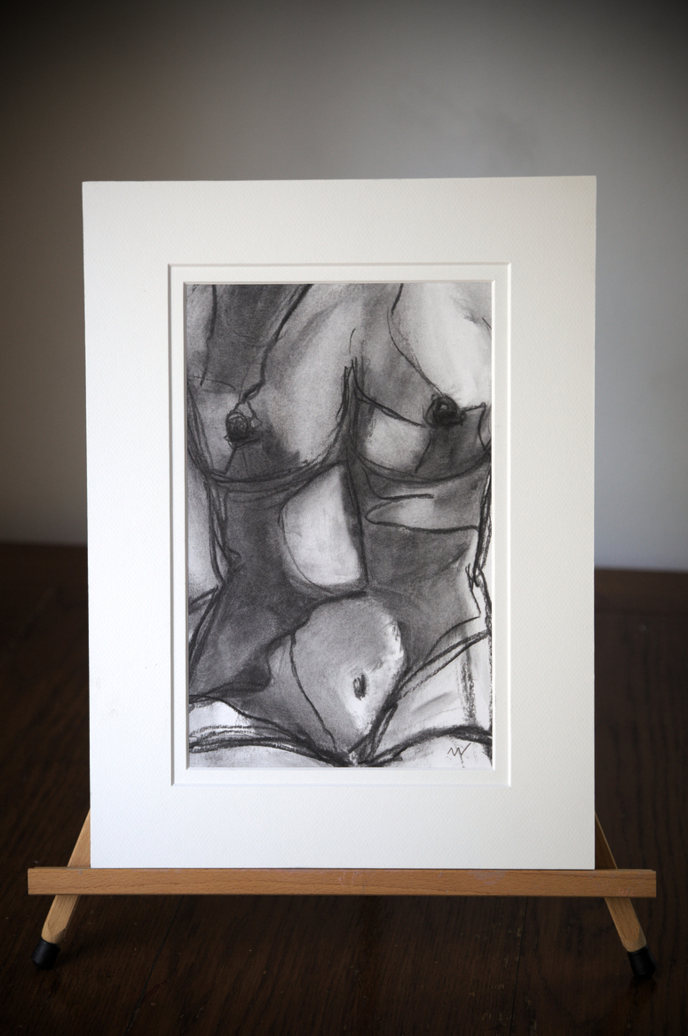 Tijdens de mantelzorg van mijn moeder heb ik tijden middagen houtskooltekeningen gemaakt. De hardheid en zachtheid van het materiaal levert verschillende sferen rondom het verbeelden van het vrouwenlichaam. Alle tekeningen zijn in een passe-partout