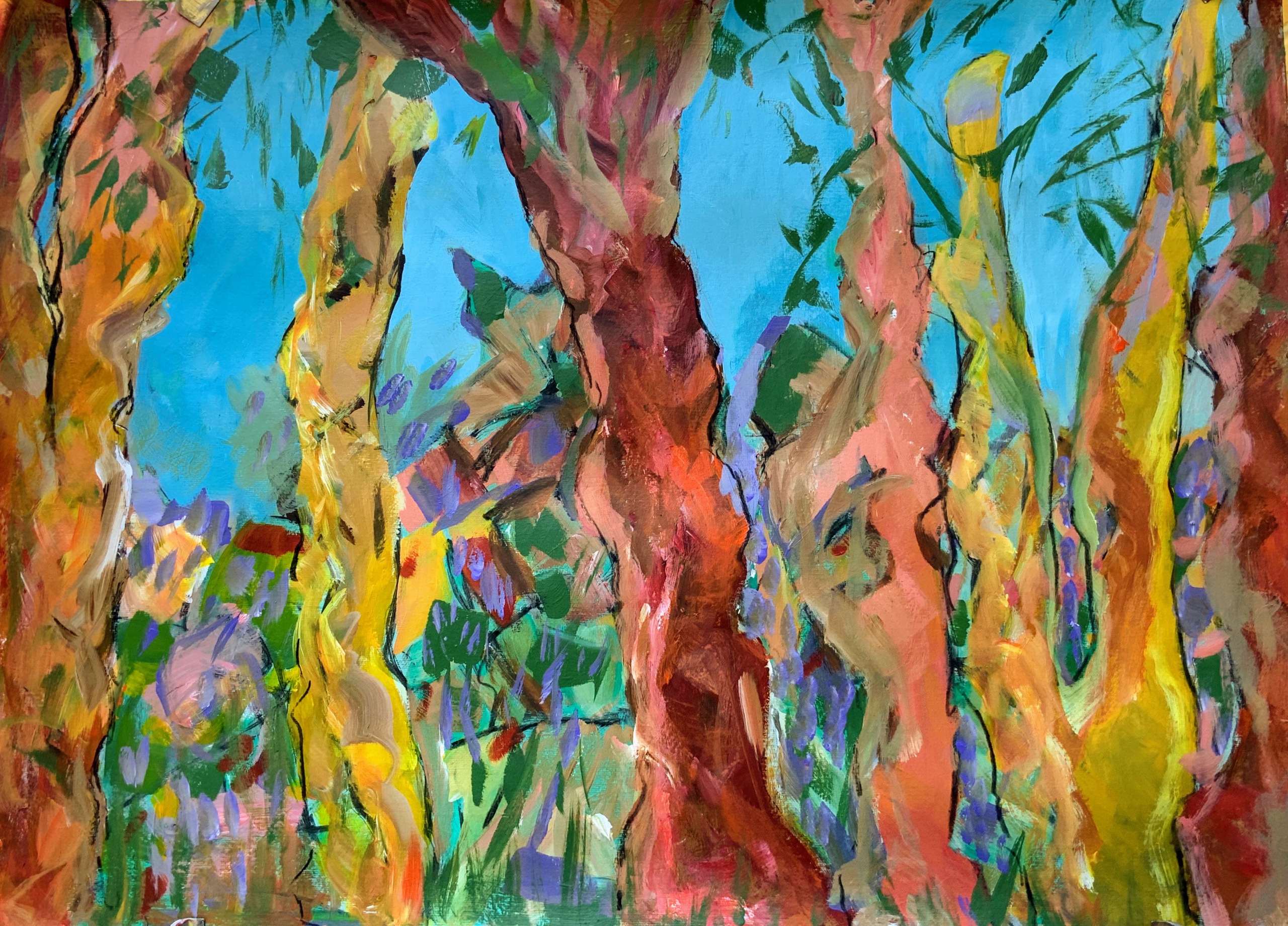 Nieuwe stijl: intuïtief en vlot geschilderde geabstraheerde bomen met acrylverf en lijnen met oostindische inkt