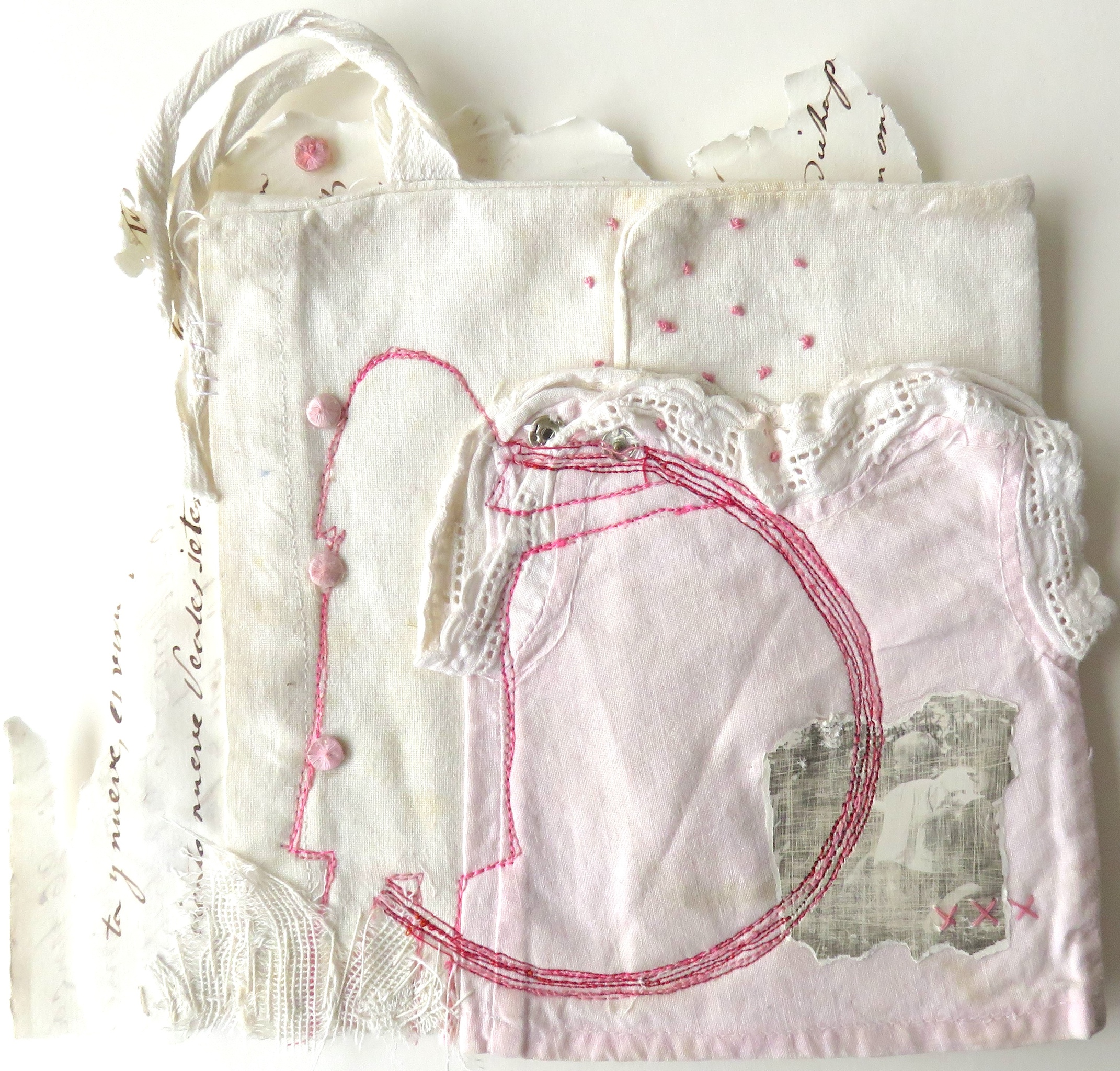 Collage op vintage textiel, handschrift 19e eeuw, foto, garen.