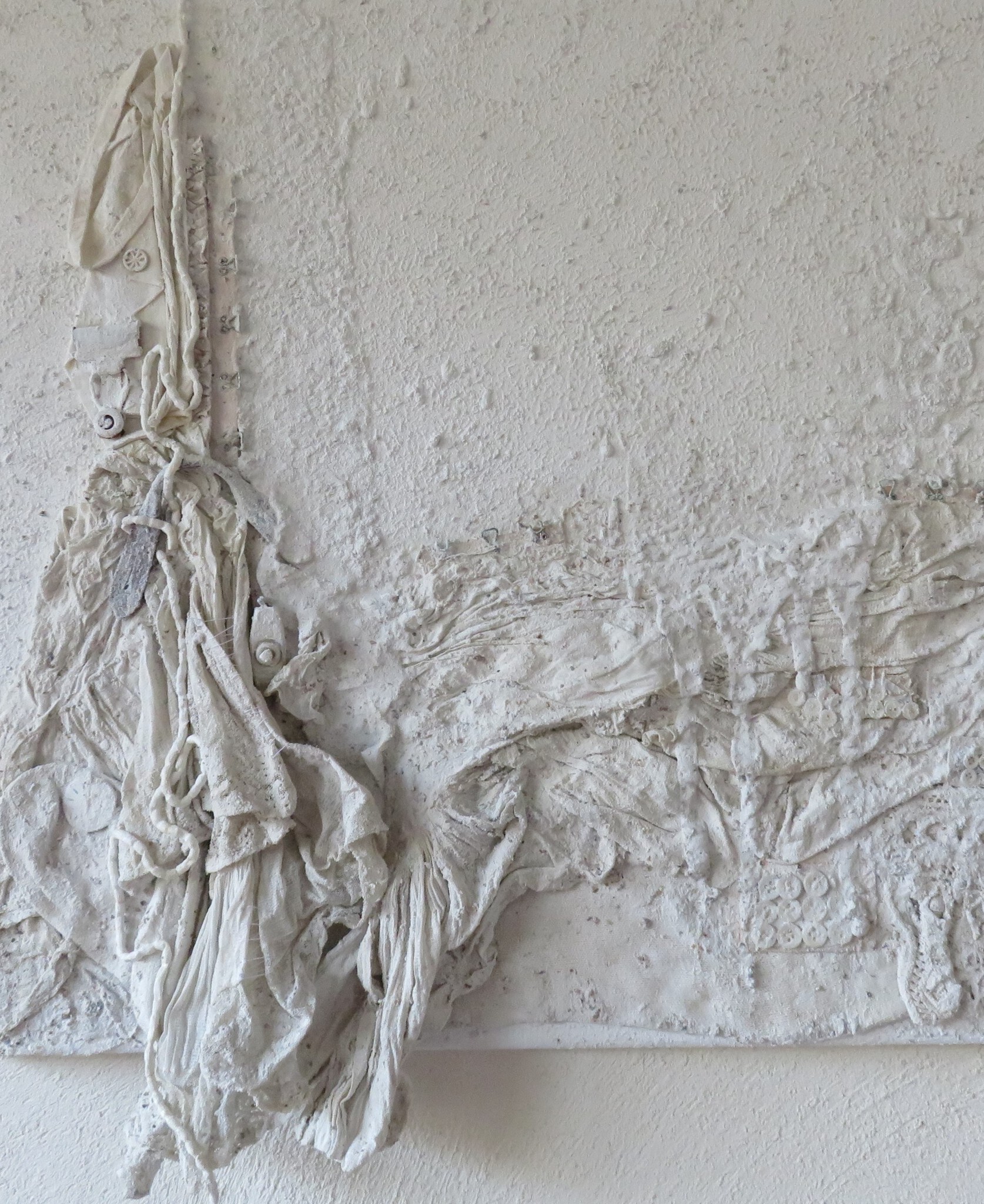 Collage op doek, genaaid van oude sok, zakje, kanten muts, jarretels, bretelhouder, gordijnlood, kmoopjes etc., gesso, acrylaatbinder.