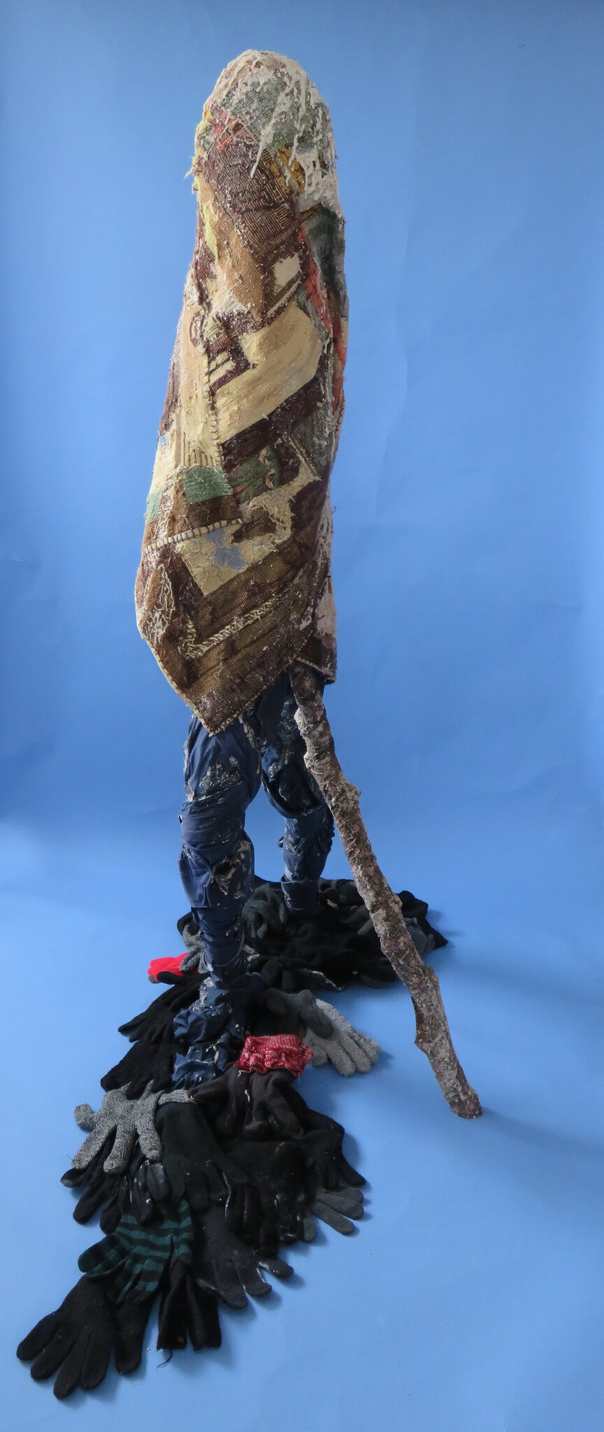 Sculptuur van oude overhemden, handschoenen, borduurwerk, hout, garen