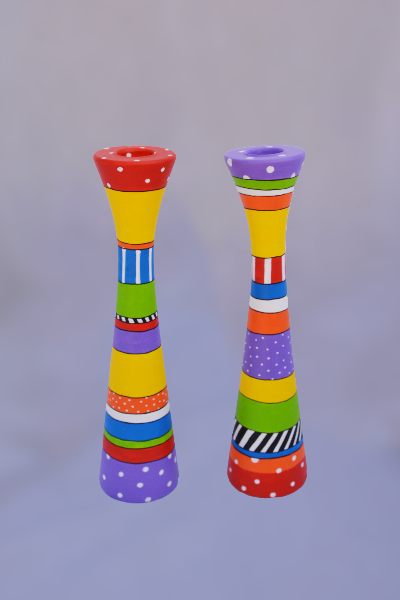 Modern beschilderde kandelaars met geometrische vormen en felle kleuren. Hier zie je werk uit de serie ‘Beelden met een tweede leven’. Dit zijn oude, houten beelden die ik heb gerepareerd en moderne, veelal kleurrijke beschilderingen heb gegeven. Hierdoor verdwijnen de versleten beelden niet in de afvalbak, maar kunnen ze een tweede leven leiden. Zo is ieder beeld duurzaam en uniek!