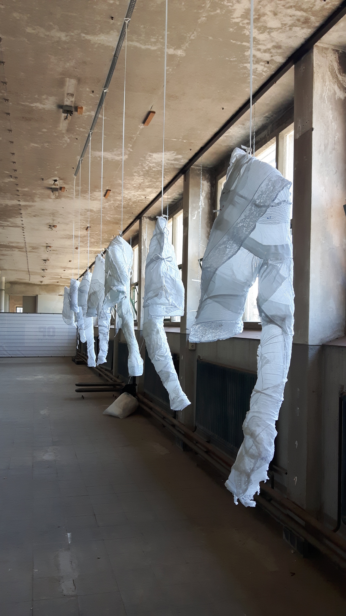 Hangende sculpturen, gemaakt van textiel ( klederdrachtmutsen uit 1900), houtlijm, garen.