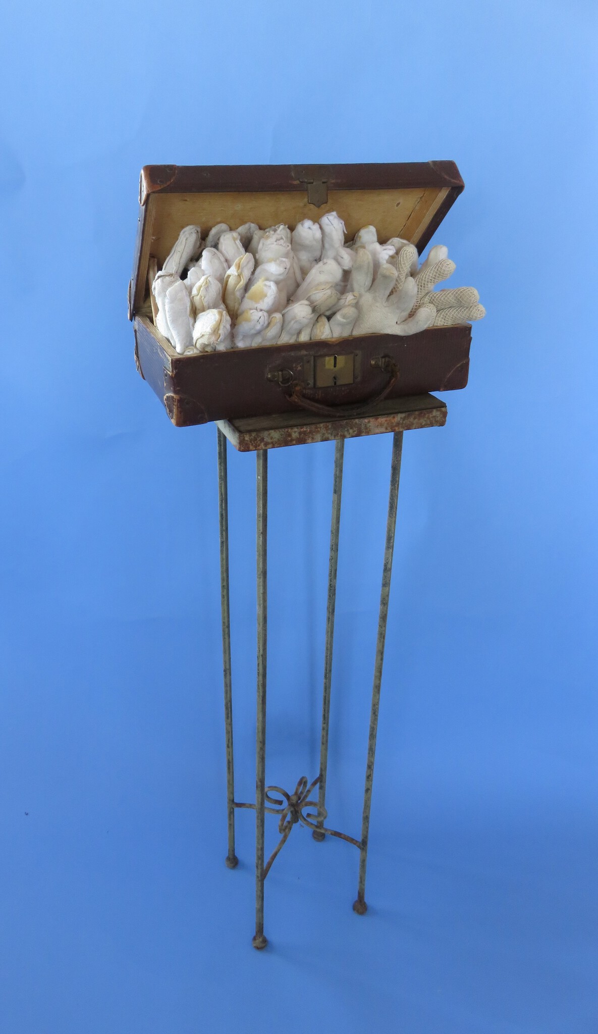 Sculptuur, genaaid, van vintage koffertje, handschoenen, garen, tafeltje.