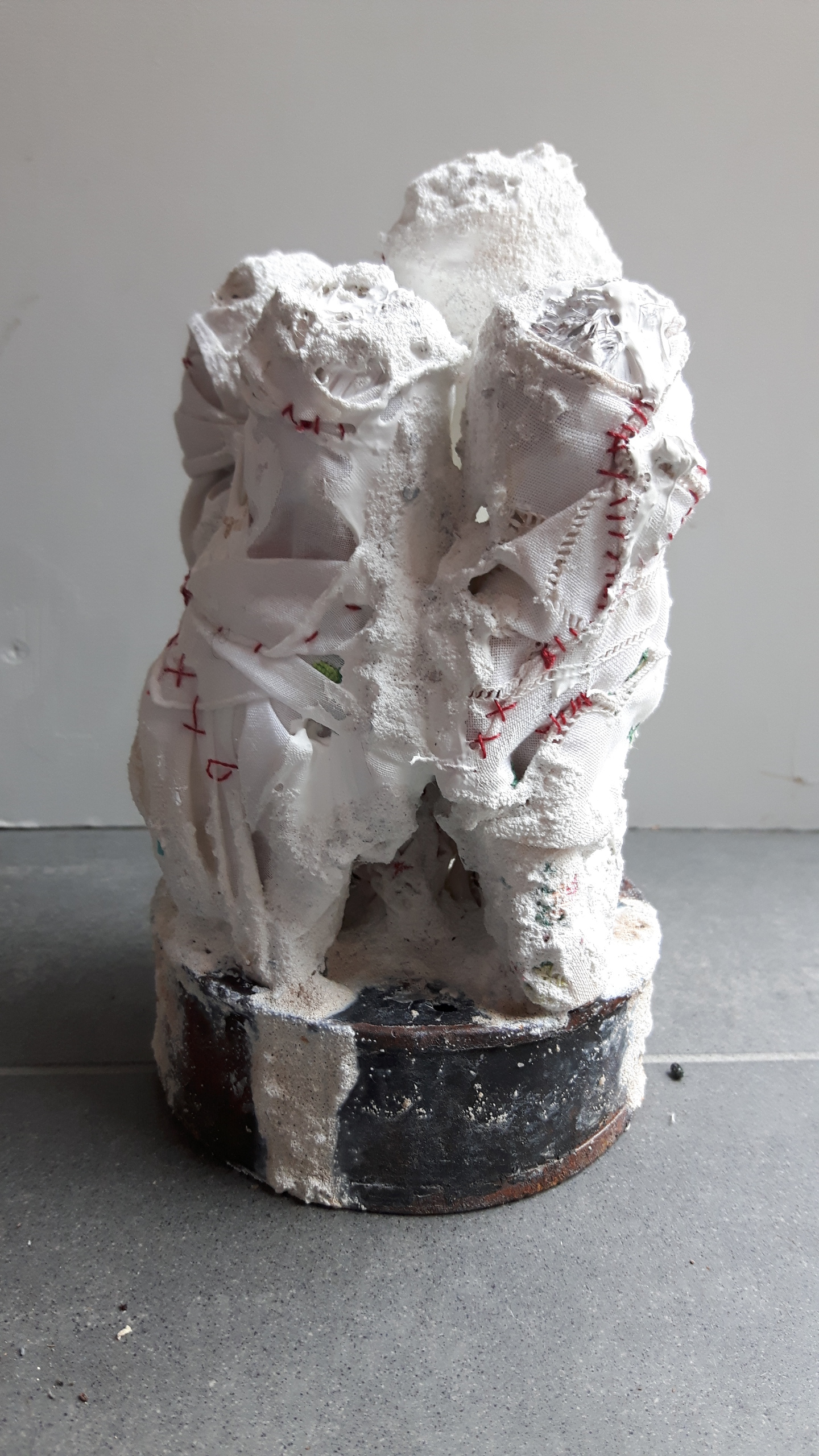 Sculptuur, genaaid, van vintage zakdoekjes, popjes, garen, gesso, oud beschuitblik.