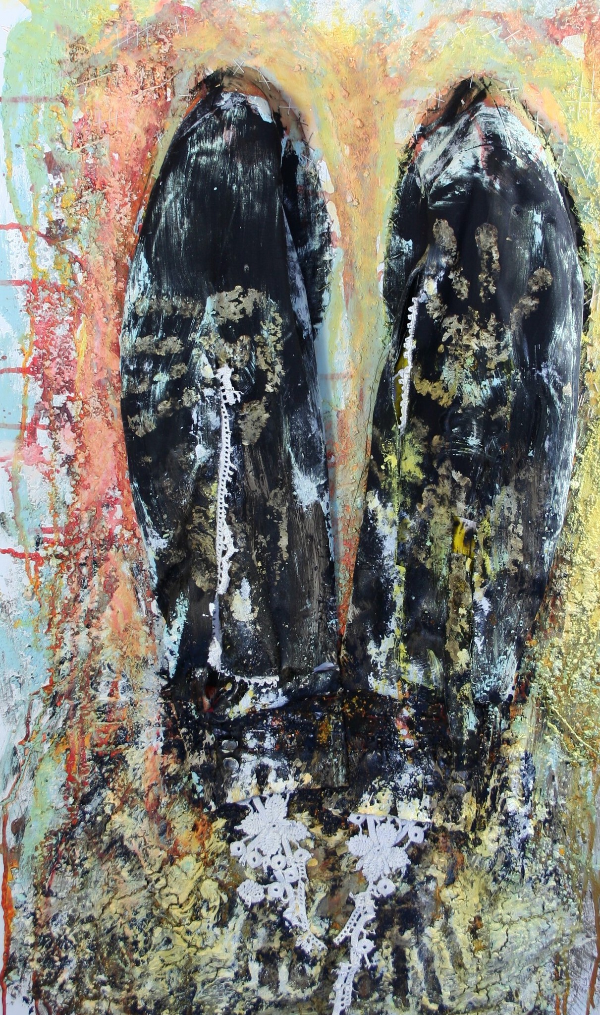 Collage genaaid op doek van oude colbertmouwen, kant, acrylverf.