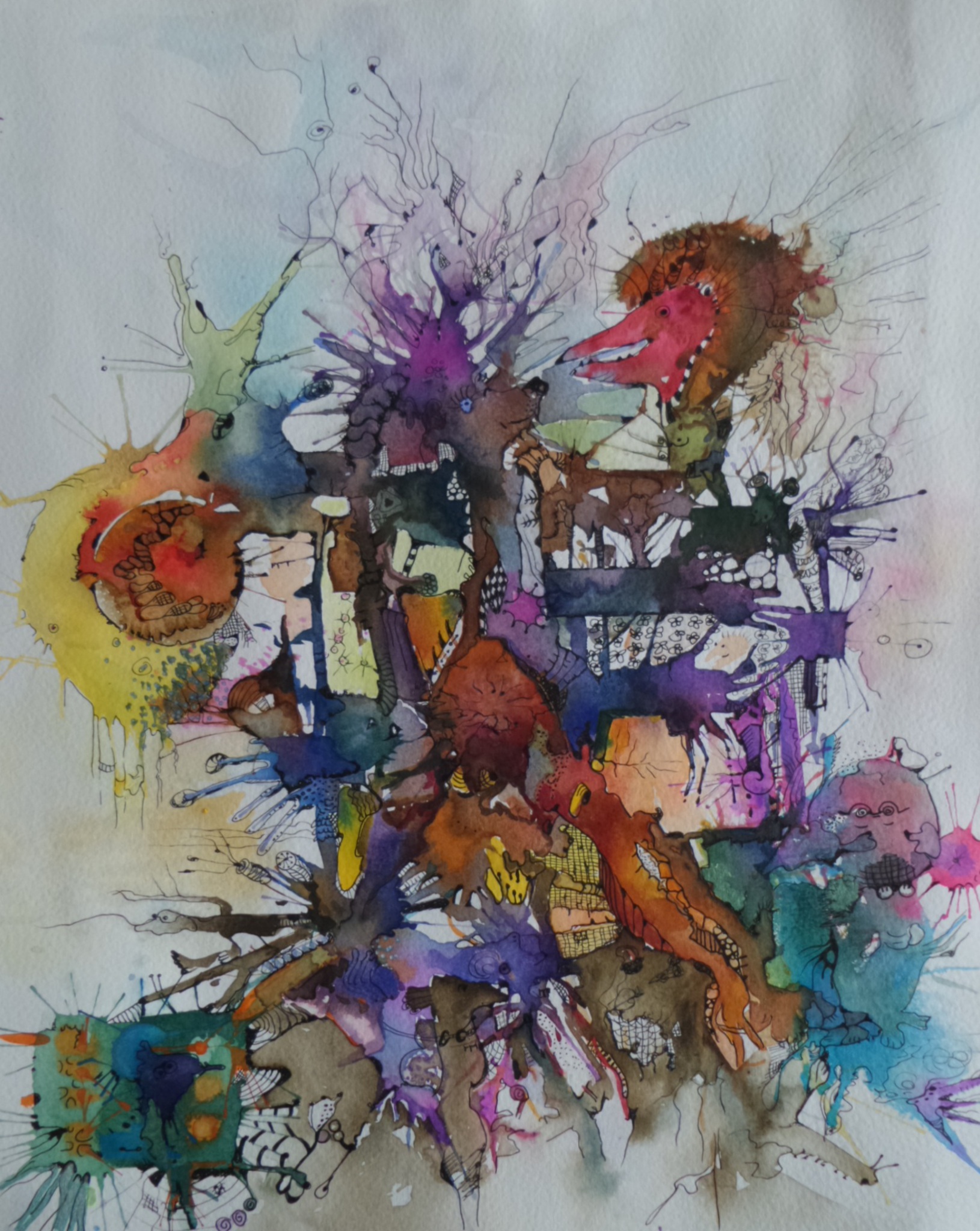 een wat groter werk in aquarel, ingelijst... Willekeurige verfplekken invullen met fineliners
