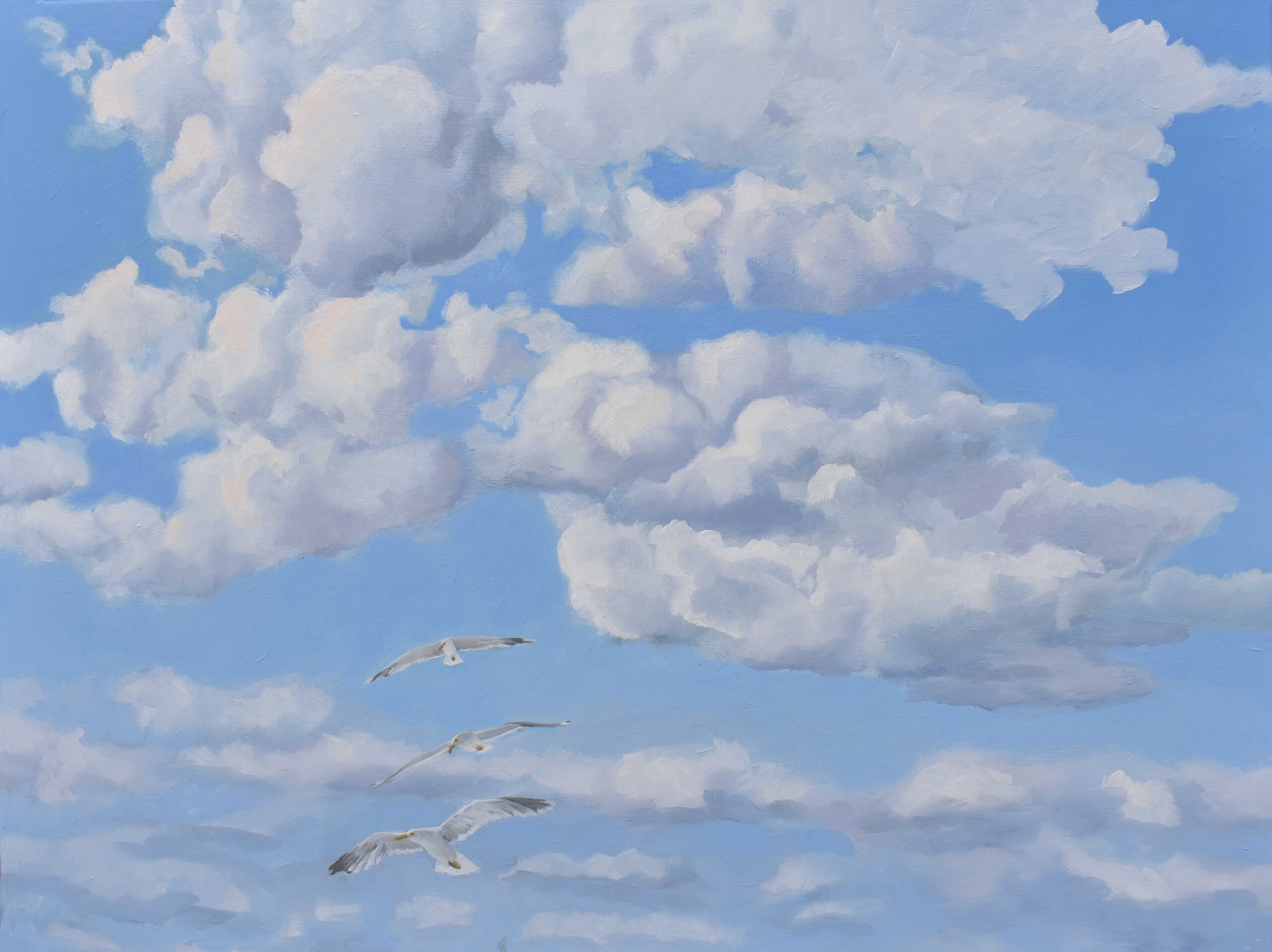 Wollige wolken, mooie blauwe lucht en 3 meeuwen. Reproductie mogelijk via WerkaandeMuur (zie "Links").