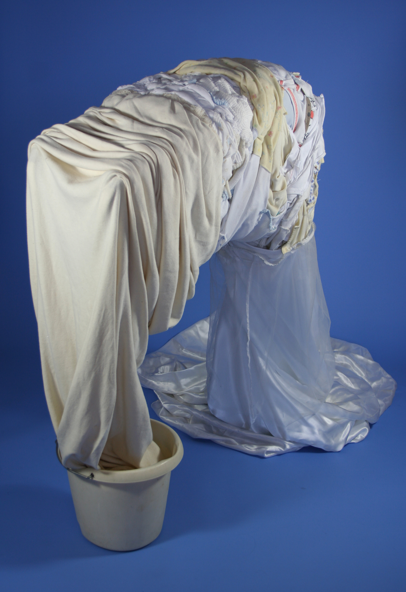 Sculptuur genaaid van textiel, vintage babyhemdjes, garen, emmertje, babybadstandaard.