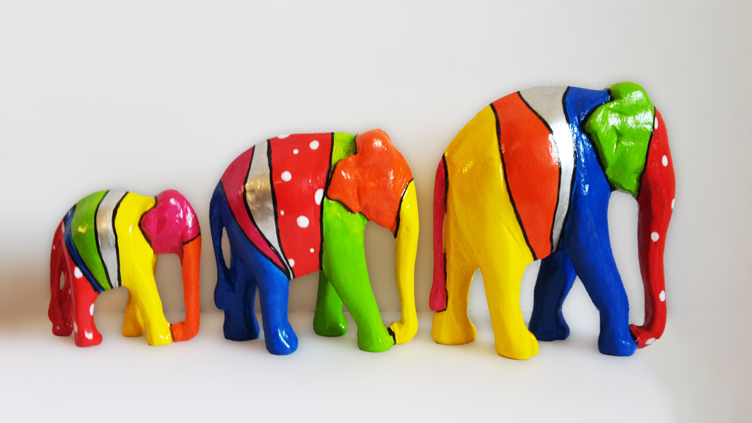 Modern beschilderde olifantjes (3 stuks, van groot naar klein). Met felgekleurde vlakken die een mooie serie vormen. Hier zie je werk uit de serie ‘Beelden met een tweede leven’. Dit zijn oude, houten beelden die ik heb gerepareerd en moderne, veelal kleurrijke beschilderingen heb gegeven. Hierdoor verdwijnen de versleten beelden niet in de afvalbak, maar kunnen ze een tweede leven leiden. Zo is ieder beeld duurzaam en uniek!