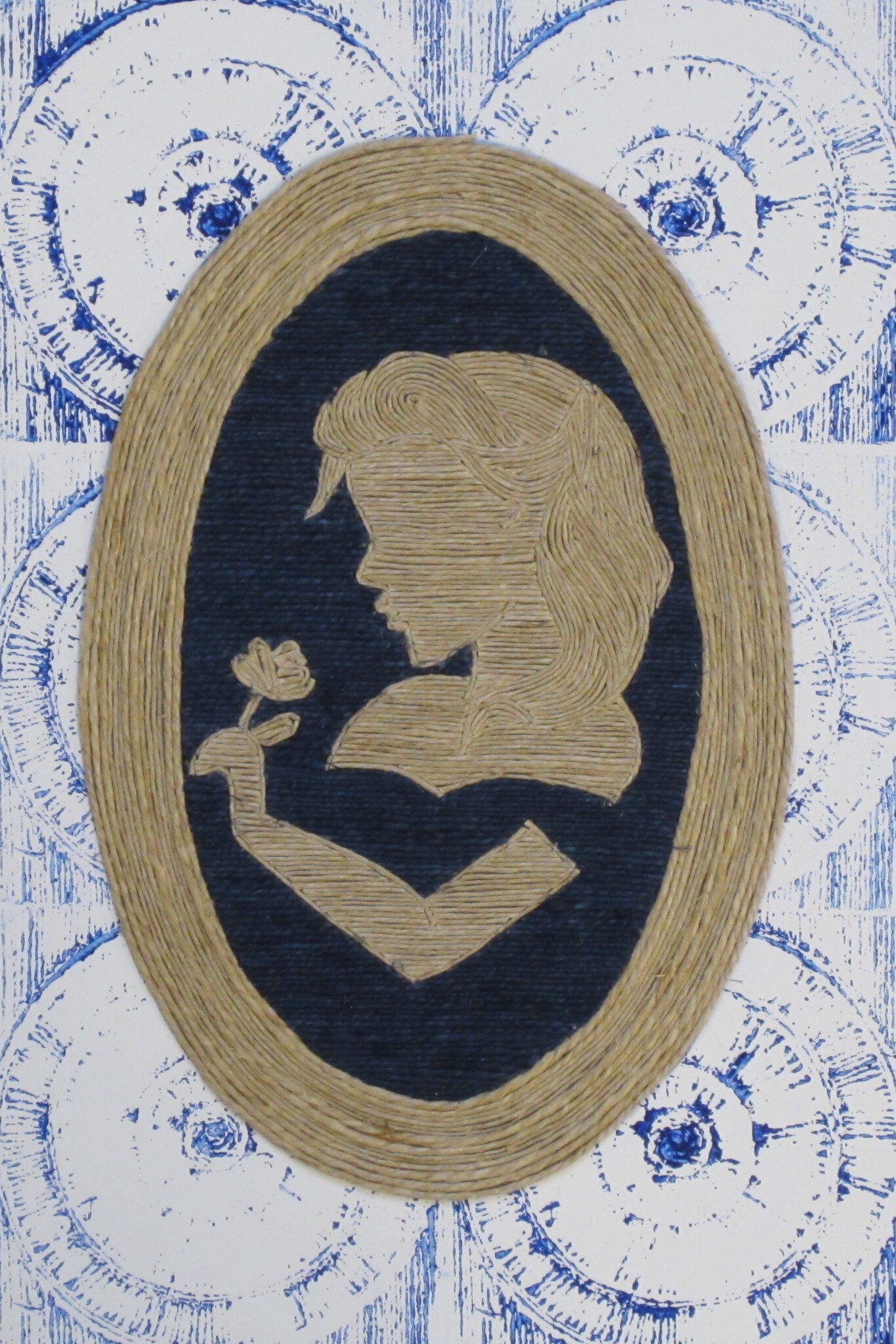 Portret van een vrouw (Cinderella) gemaakt van vlastouw in een medaillon. De rand is gedrukt met touwstempels.