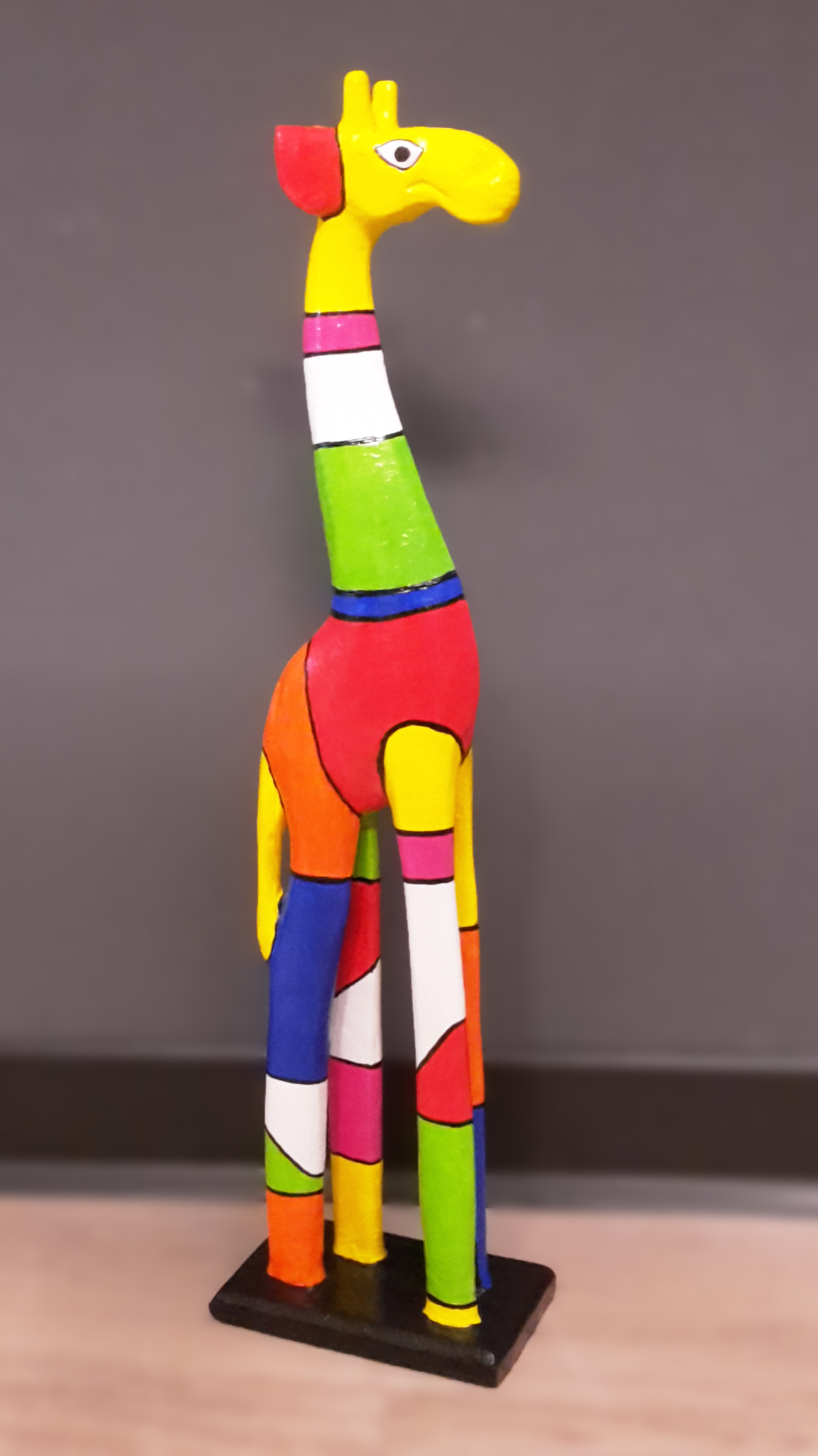 Modern beschilderde giraffe met geometrische vormen en felle kleuren. Hier zie je werk uit de serie ‘Beelden met een tweede leven’. Dit zijn oude, houten beelden die ik heb gerepareerd en moderne, veelal kleurrijke beschilderingen heb gegeven. Hierdoor verdwijnen de versleten beelden niet in de afvalbak, maar kunnen ze een tweede leven leiden. Zo is ieder beeld duurzaam en uniek!