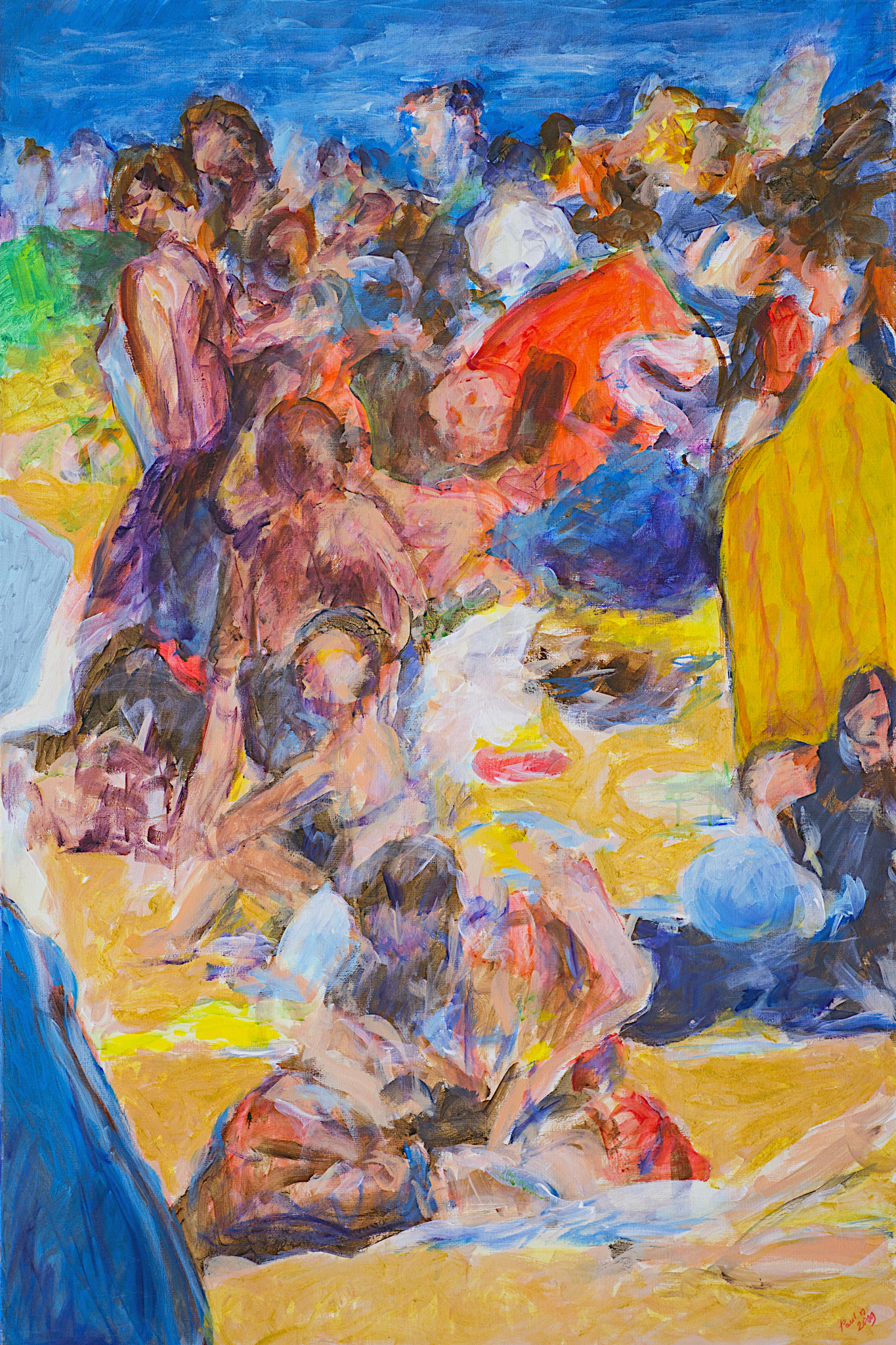 Groot schilderij van strandtafereel. Strand van de Noordzee met kleurige badgasten. Expressionistisch geschilderd. Het kunstwerk maakt deeluit van een tweeluik."Te kust en Te keur" en "De kust en De kleur". Ook als hoogwaardig kunstdruk verkrijgbaar,