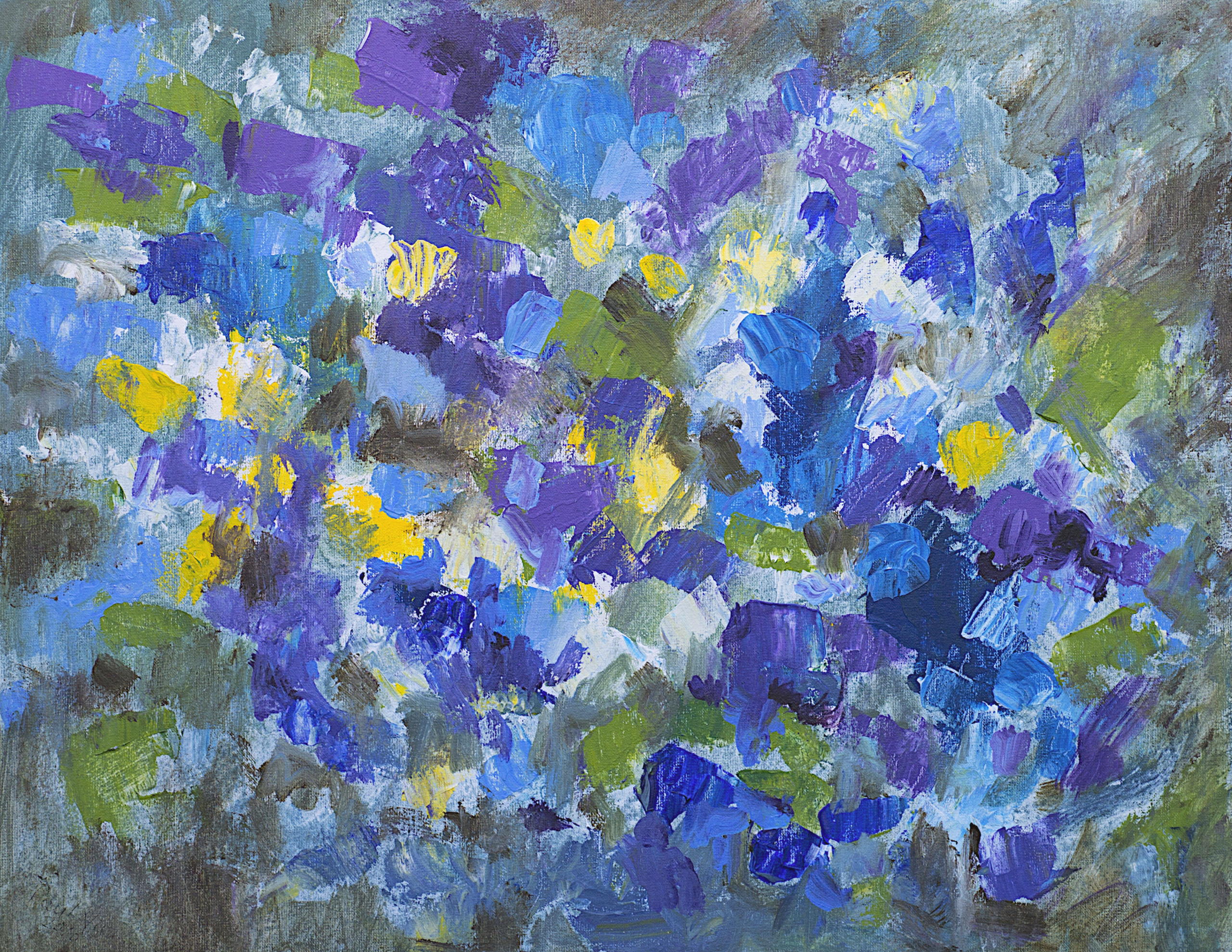 Impressionistisch en abstract geschilderd schilderij met vlotte toets en met expressief opgezet. Mooie afgewogen blauwe, violette, gele kleuren van de bloemen. Te verkrijgen als schilderij, kunstkaart en als hoogwaardige kunstdruk, giclée. .