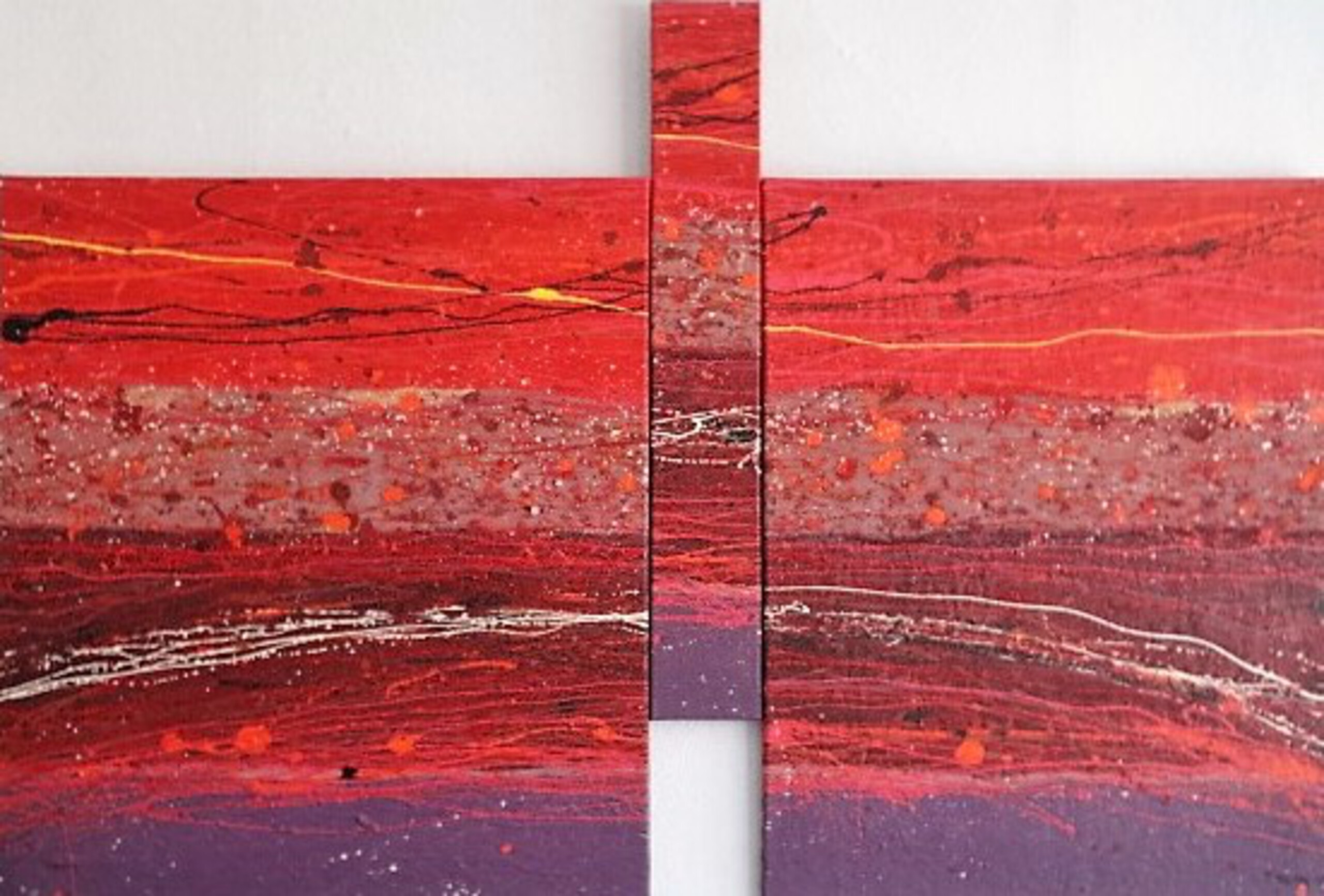 Rode Aarde, warme sfeer met een omhoogstuwend gedeelte. olieverf,zand op linnen (3delen)