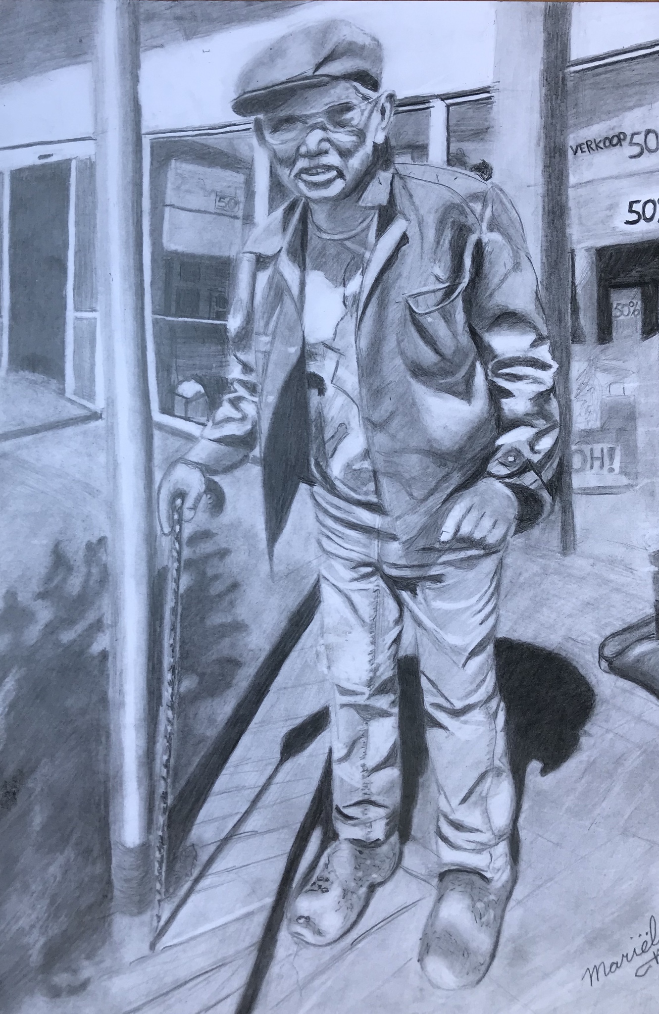I spoke to this man (unfortunately I don't know his name) here on the square in Roelofarendsveen. I liked his clogs and got into conversation. He said he's been wearing them since he was 16 and is now 81 years old. I asked him if I could take a picture of him and if he would give permission if I were to draw him. He agreed. When I asked him where he lived, he said that he no longer knew that very well, but his girl ... whom he has been living with for 60 years now, knows that, so it would be fine ....
