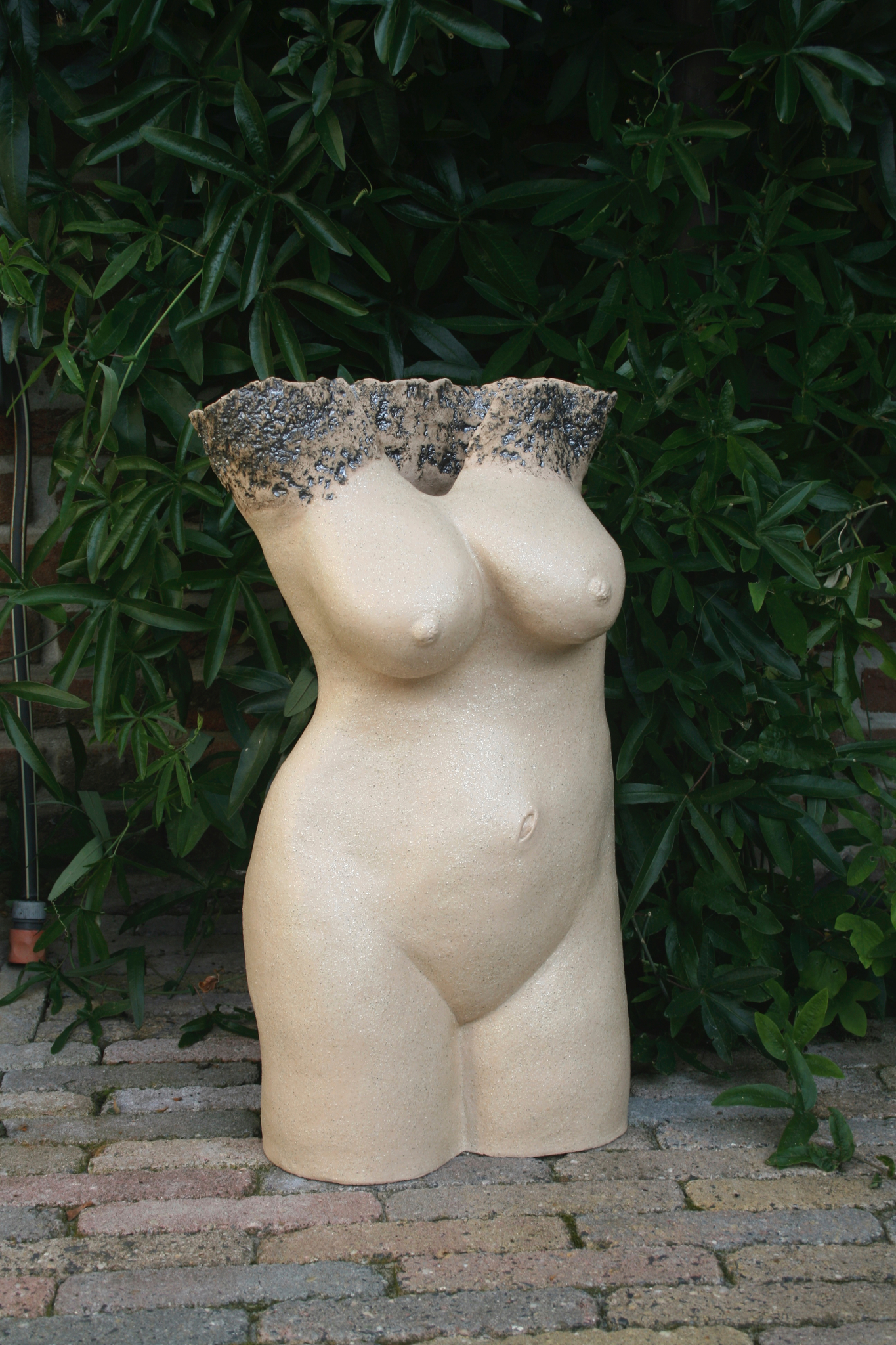 Deze torso is op 1060 graden gebakken en alleen voor binnenshuis geschikt of zomers buiten in de tuin te plaatsen.