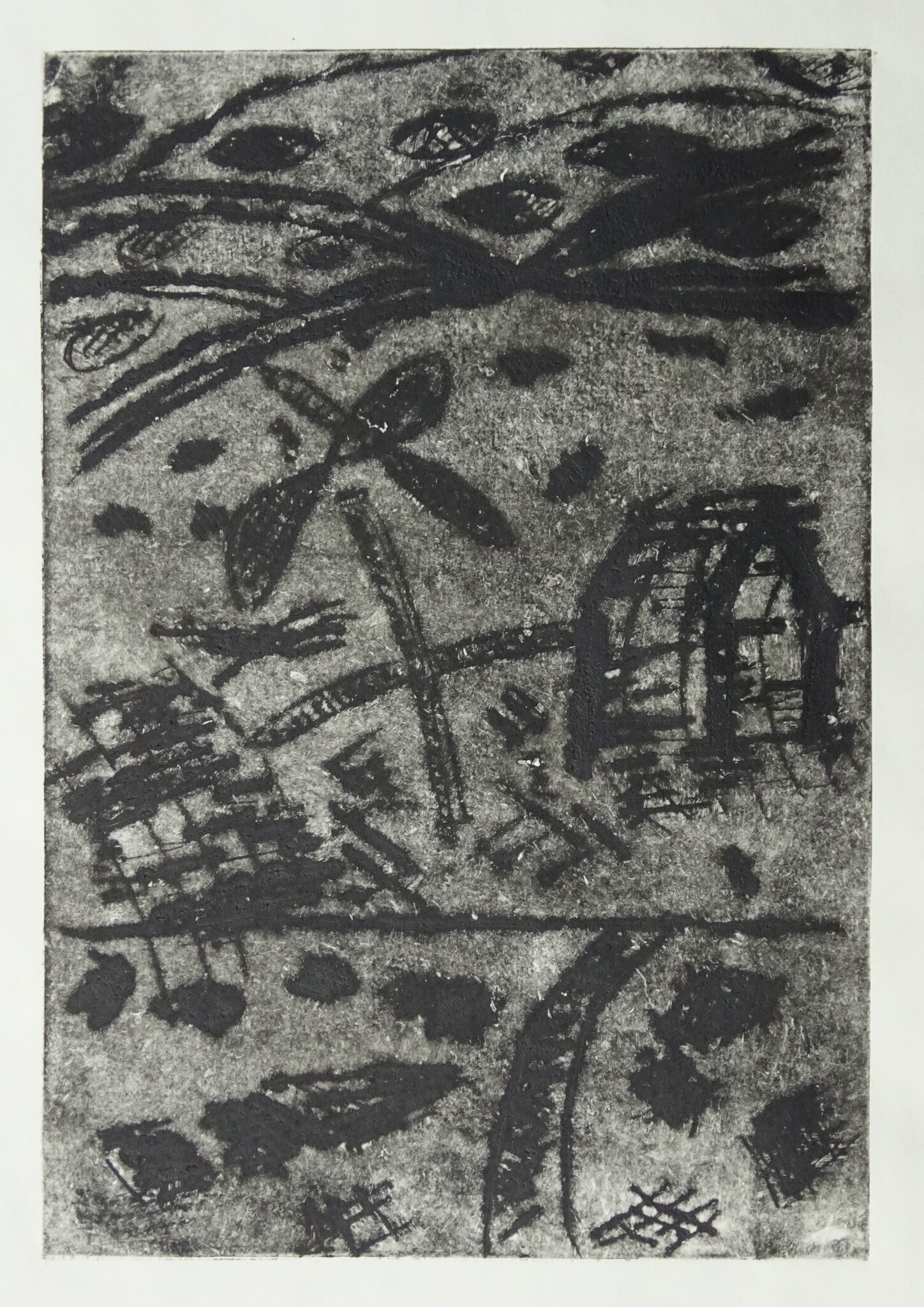 gedicht: zie engelse pagina. Koude naald ets, oplage 3. beeld 15x10 cm