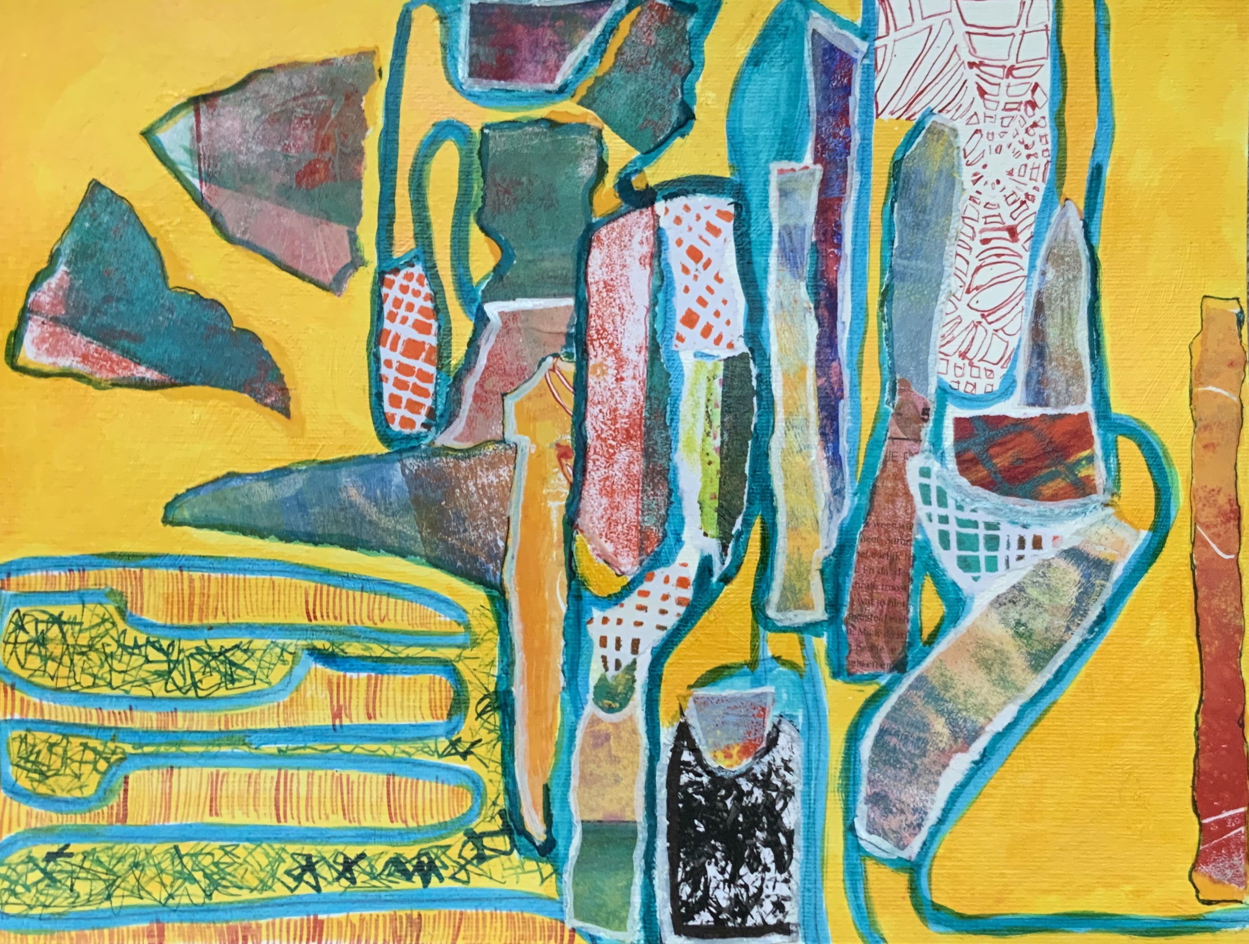 Op een gele achtergrond zijn stukken monoprint en stukken gelliplate -afdrukjes opgeplakt, dit geheel is omgeven door lijnen