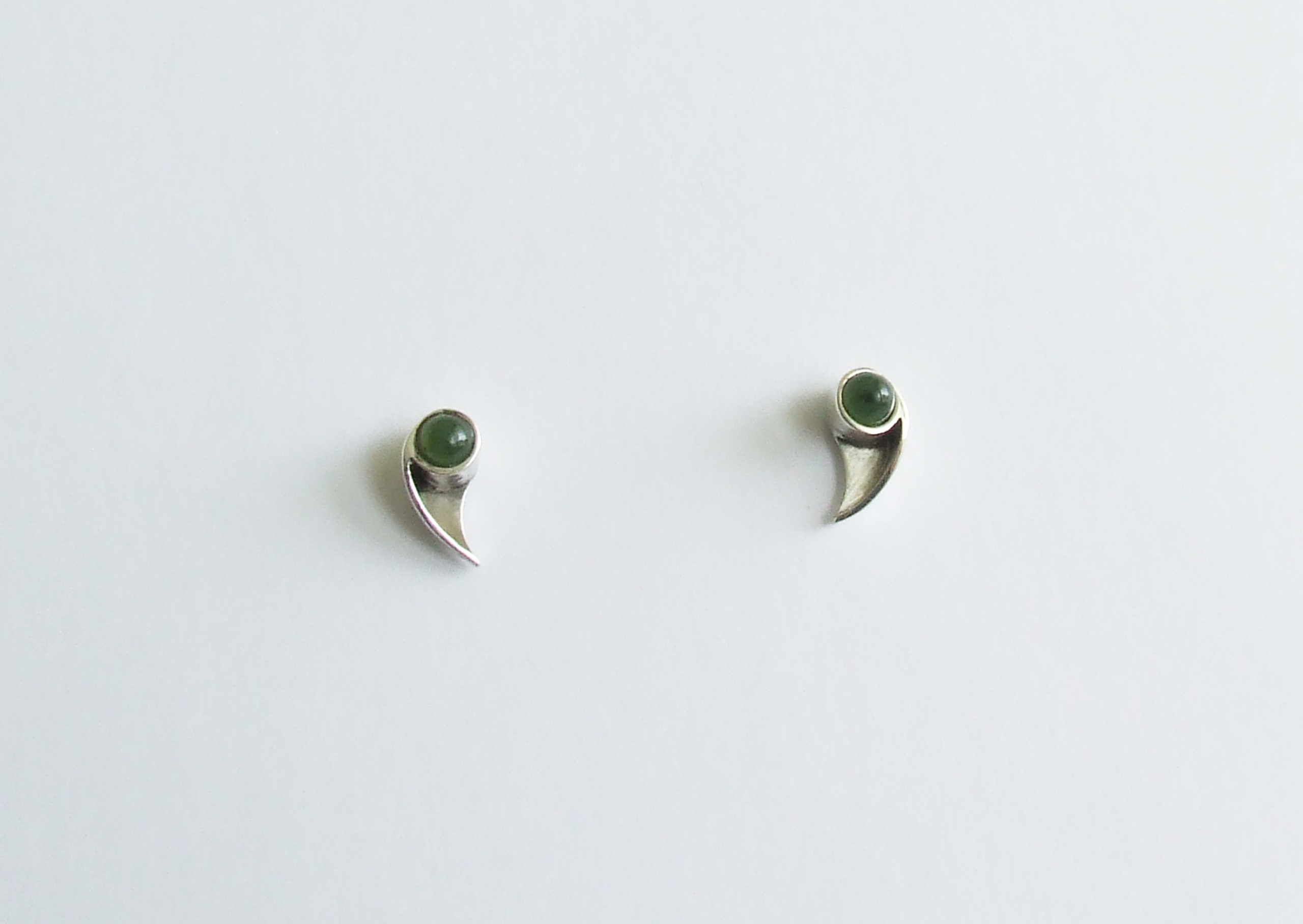 Set oorknopjes bestaande uit twee verhoogde zetbakjes met elk een gekromde en schuin aflopende punt. Hierin is een cabouchon-geslepen nefriet gemonteerd. De steker is voorzien van een poussetvlinder. Het geheel is hoogglans gepolijst. (ontwerpopdracht S1201)