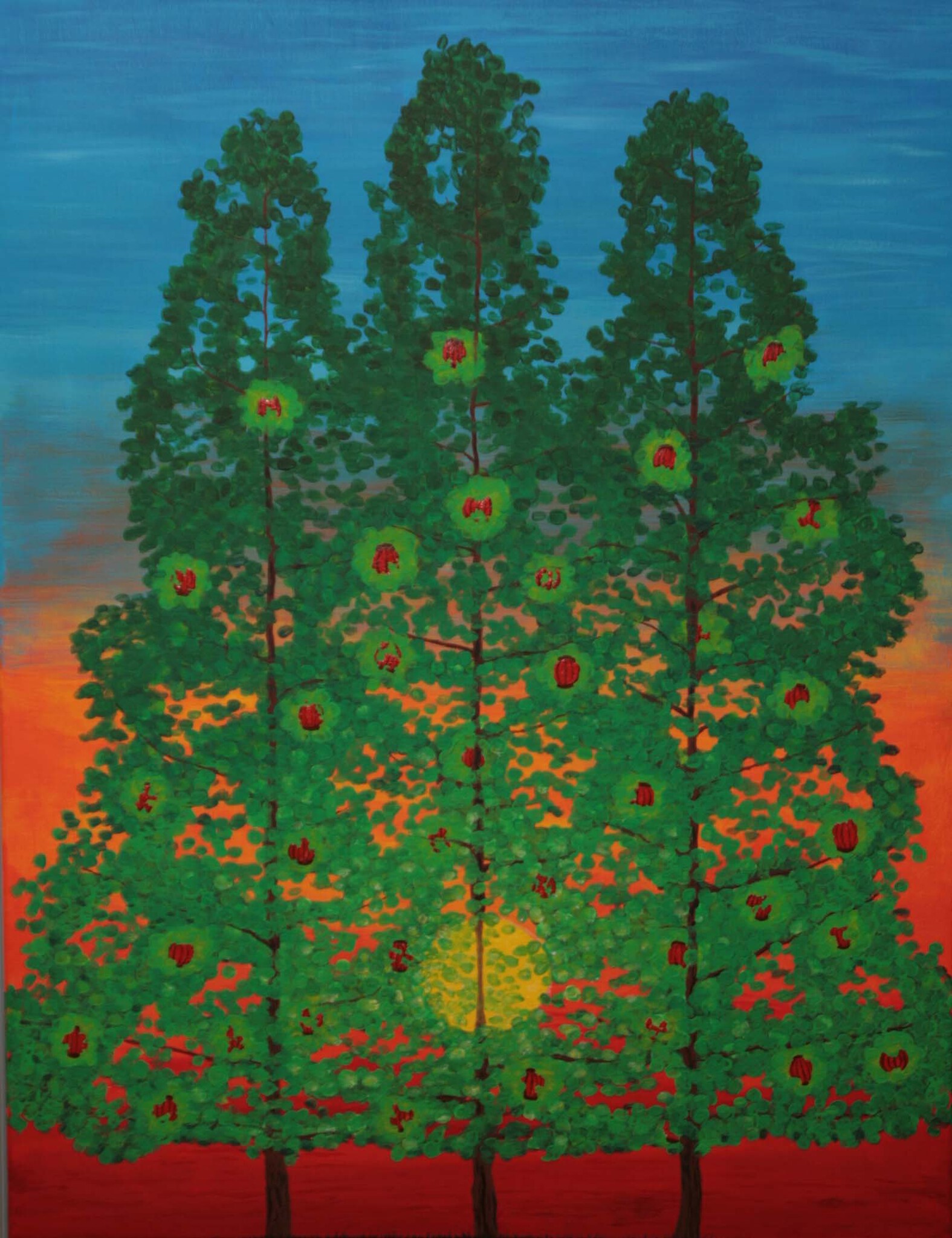 in de avondzon staan 3 bomen vol chinese lampionen hun feest te vieren