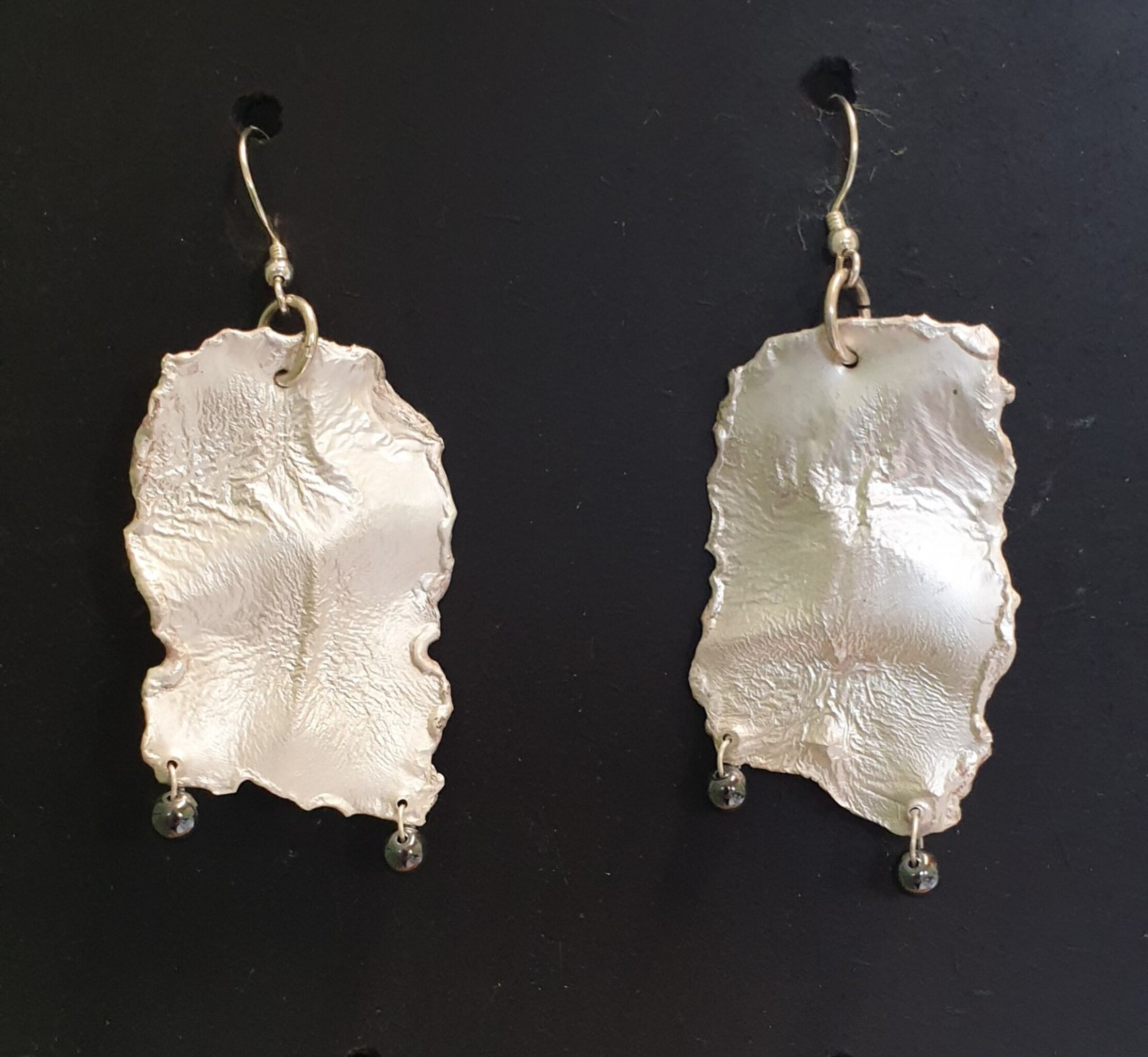 Oorbellen van bewerkt zilver met zwarte glaskraaltjes.