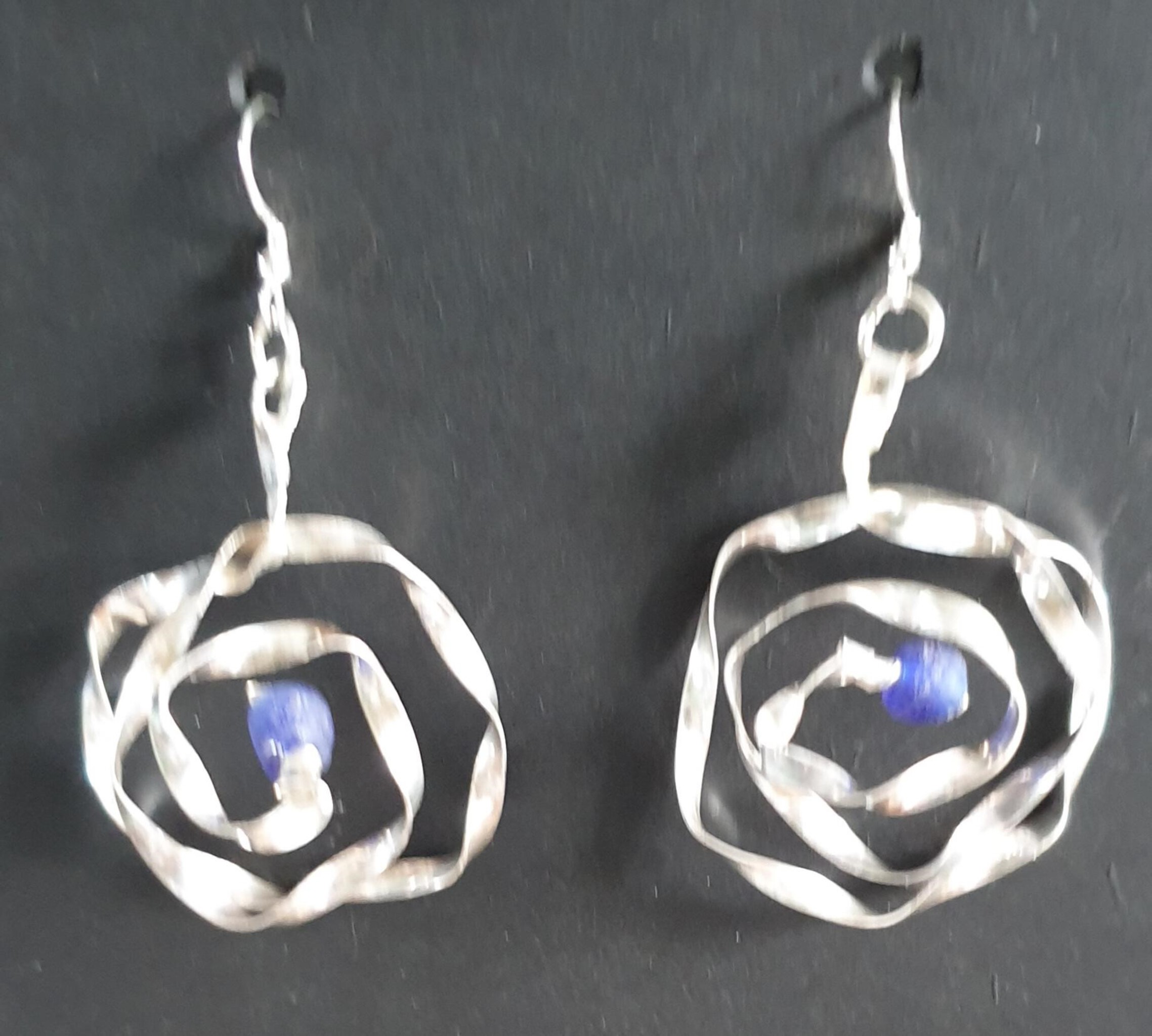 Oorbellen van gedraaid zilver met blauwe glaskraal.