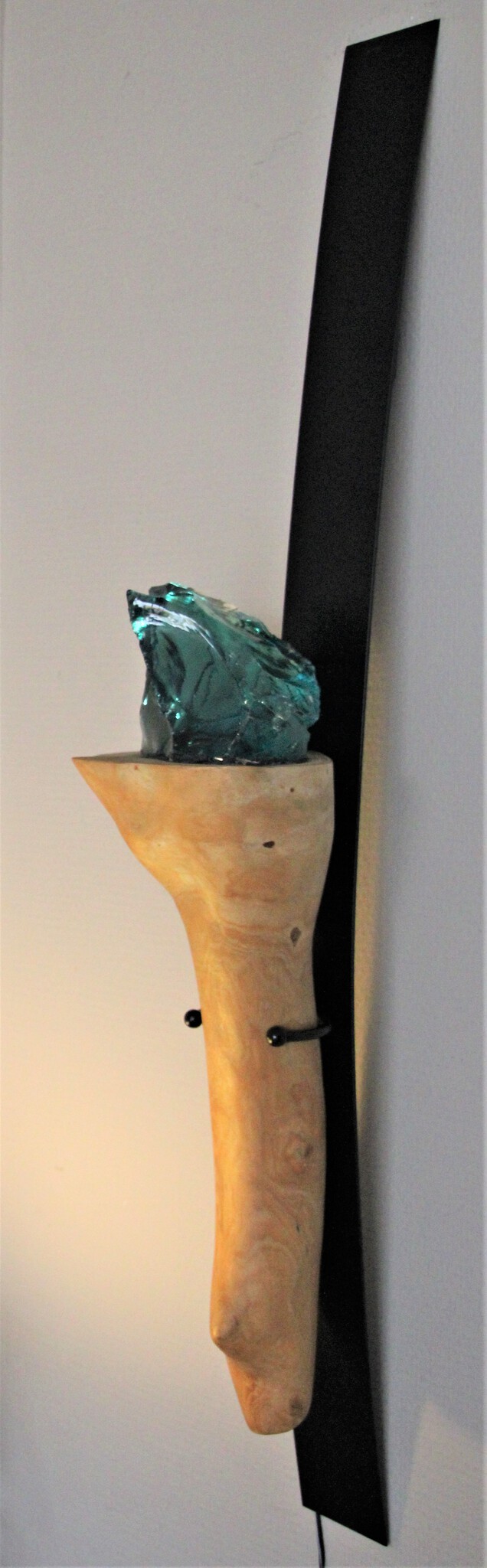 Zwart Hout Glas Licht Beeld Metaal Lamp Verlichting Sculptuur Beeldhouwwerk Kasteel Houtwerk Esdoorn Toorts Beugel Snoer Elektra Lamplicht Glasbrok