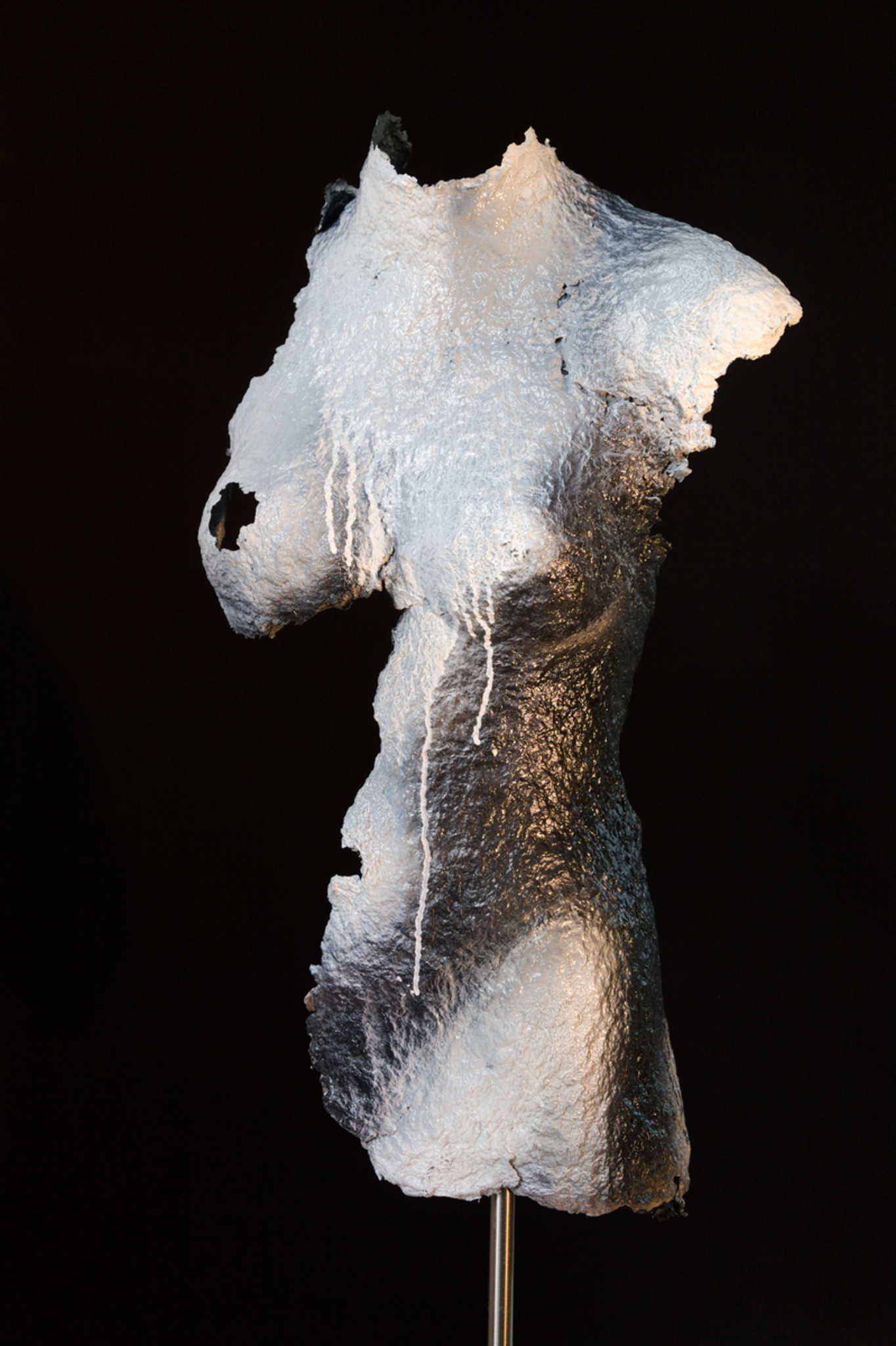 Torso gemaakt van papier van delen vrouwentorso zwart/wit/zilver hangend op standaard