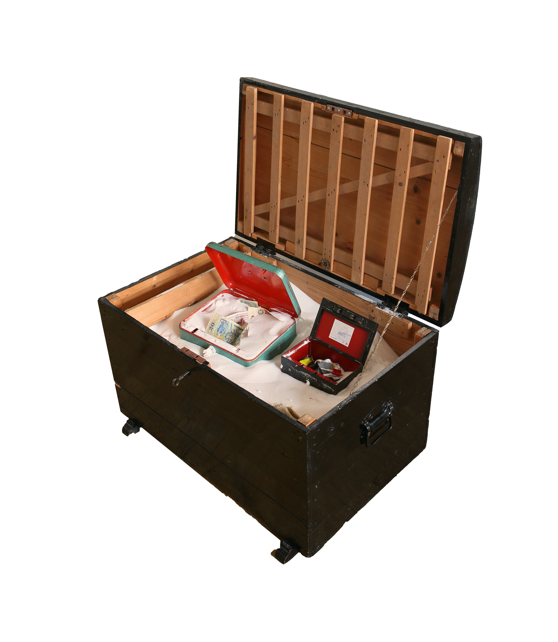 Een zwart gelakte houten verhuiskist met 250 kilo zout en een schat