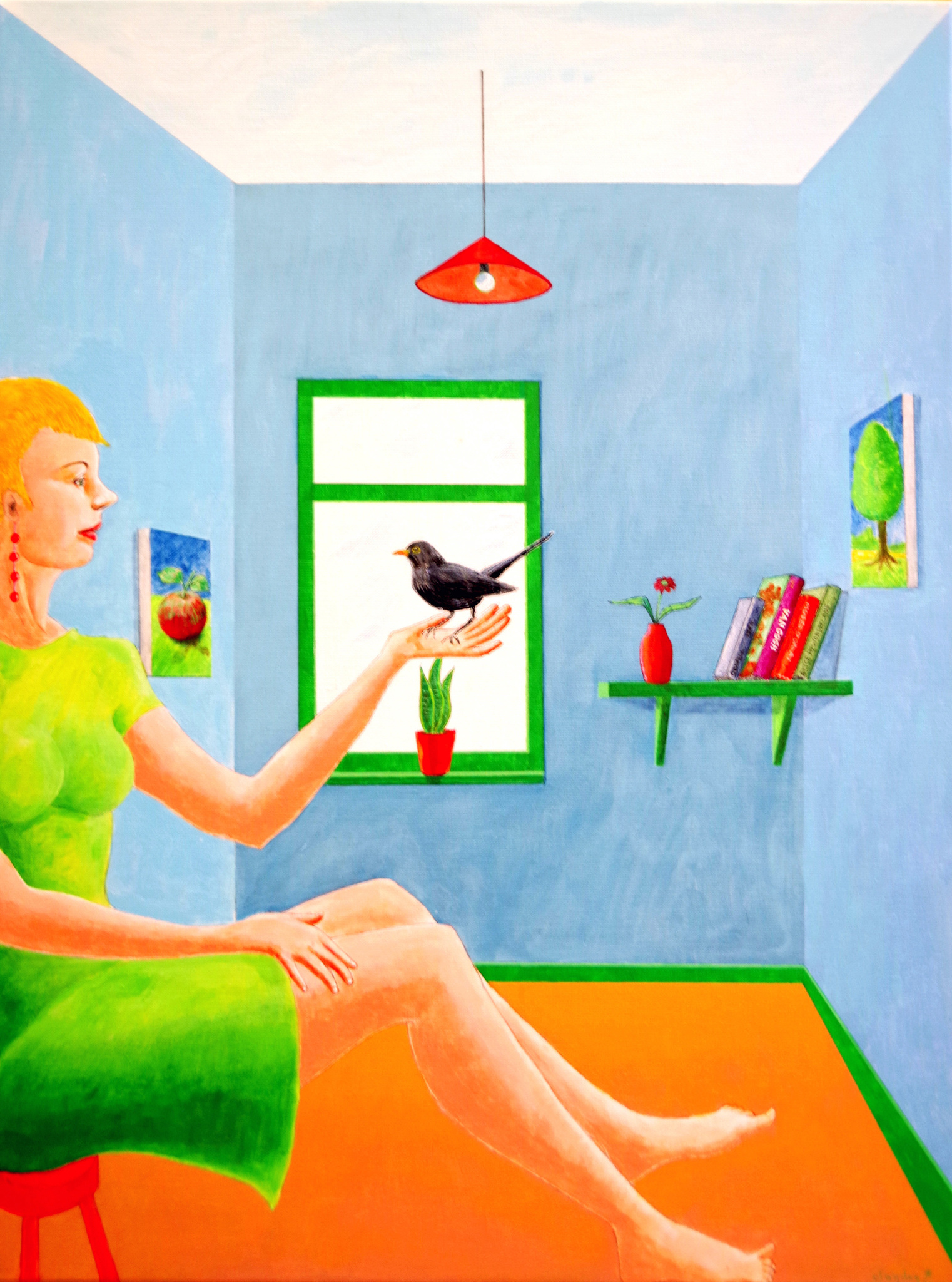 Acryl Kleurig Vrouw Boeken Raam Kamer Merel