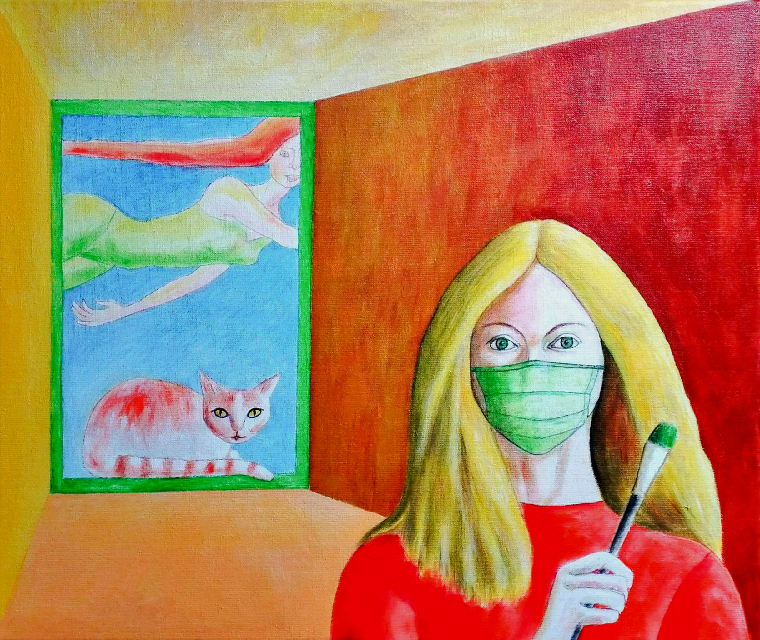 Acryl Vrouw Kleurrijk Kat Mondkapje Penseel Kunstschilder Lockdown Kattenstad