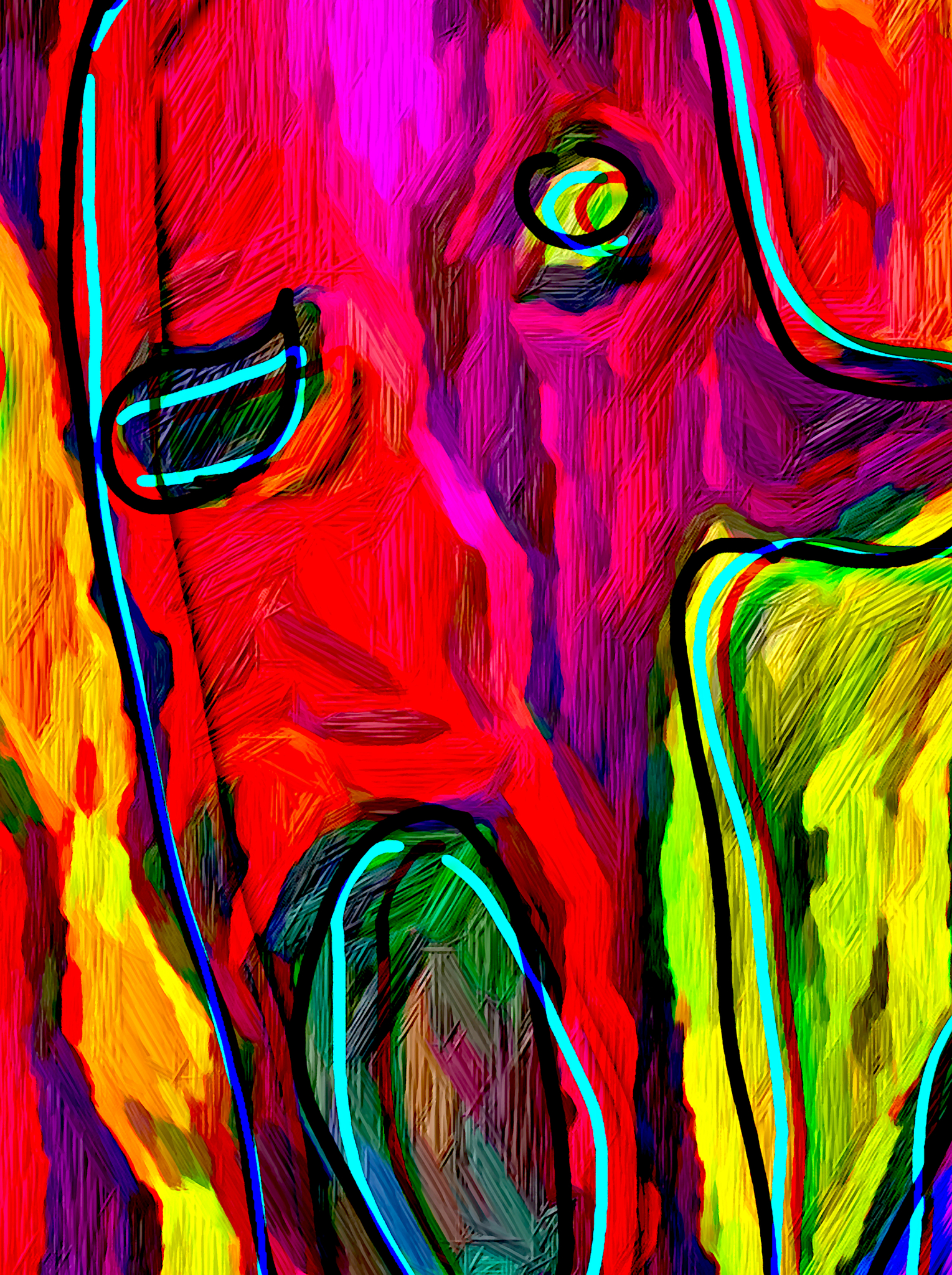 De felle, expressieve kleuren zijn in lijn met de emotie in dit digitale schilderij. De menselijke geest stuit op een onverwachte gebeurtenis. Loopt dat goed af? Attentie: het werk wordt ingelijst geleverd. Zie voor meer info de pagina Levering.