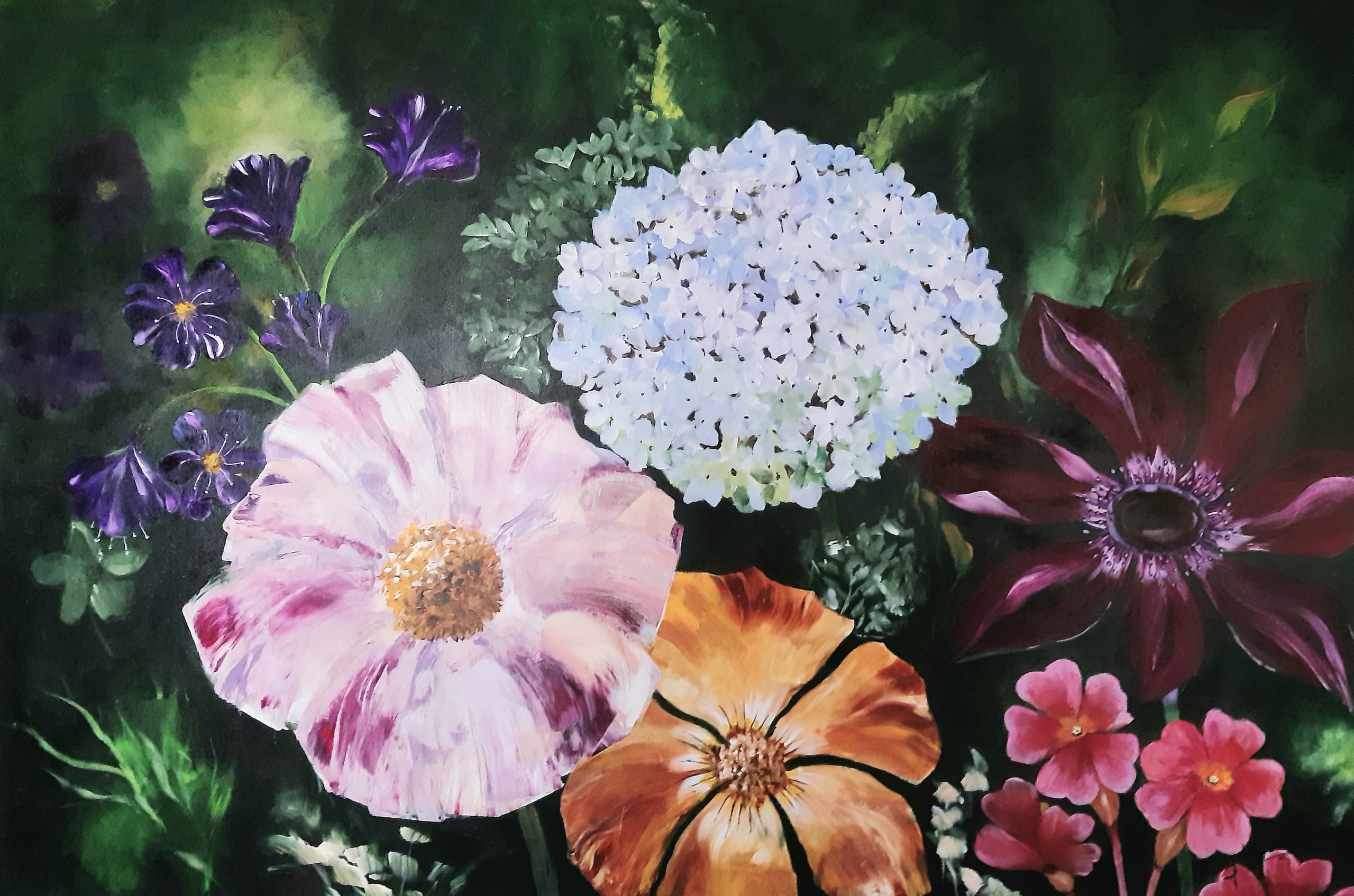 Acryl schilderij in vlotte stijl geschilderd, vrolijke kleuren tegen een donkergroene achtergrond. Een echte blikvanger in de woon-, werk-, of slaapkamer. Beslist geen muurbloempje!