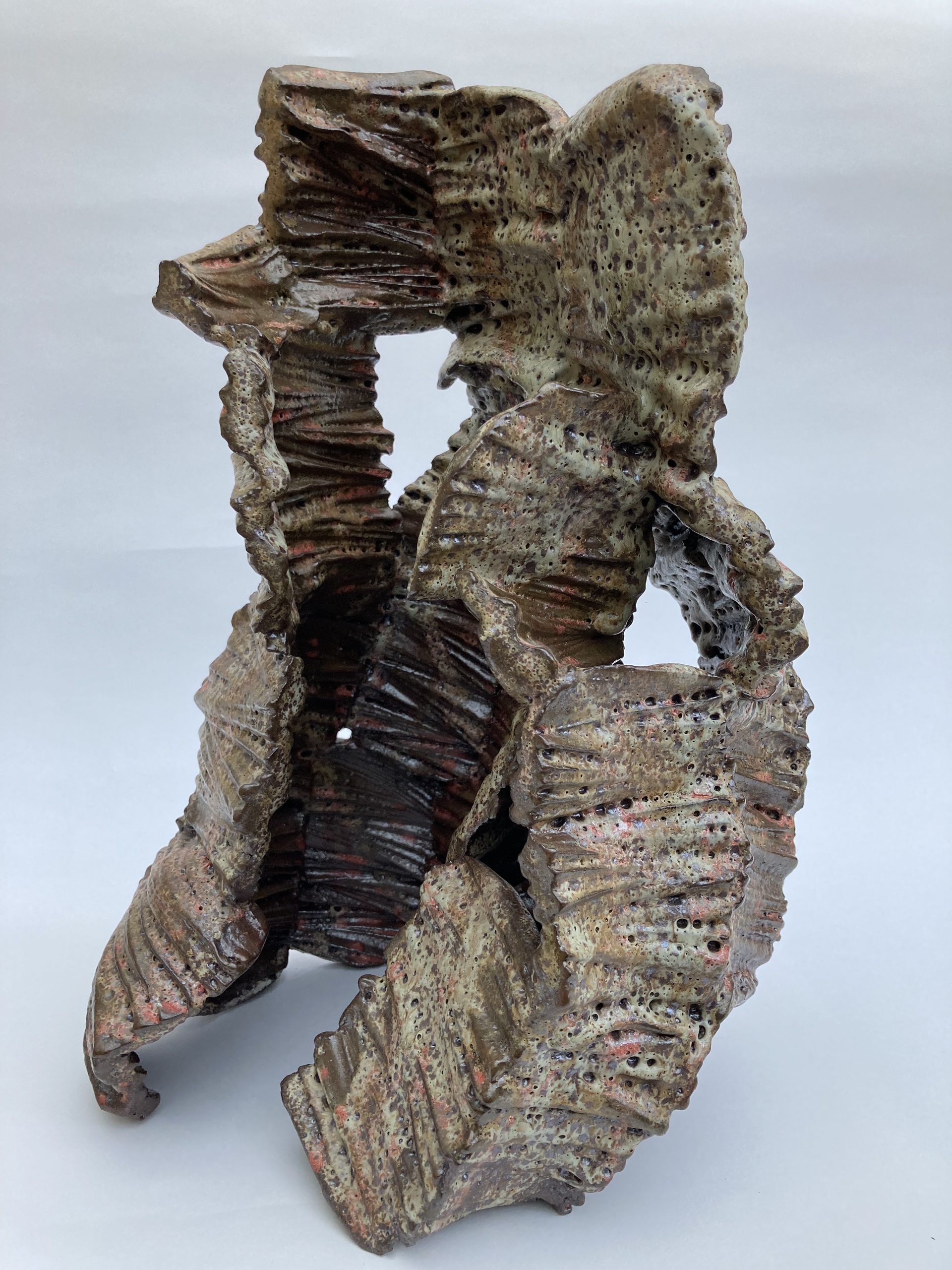 Zoektocht in keramiek: vrouwzijn in vloeiende lijnen en contouren; hoge dunne vaasvormen als weerspiegeling van een zoektocht naar identiteit...