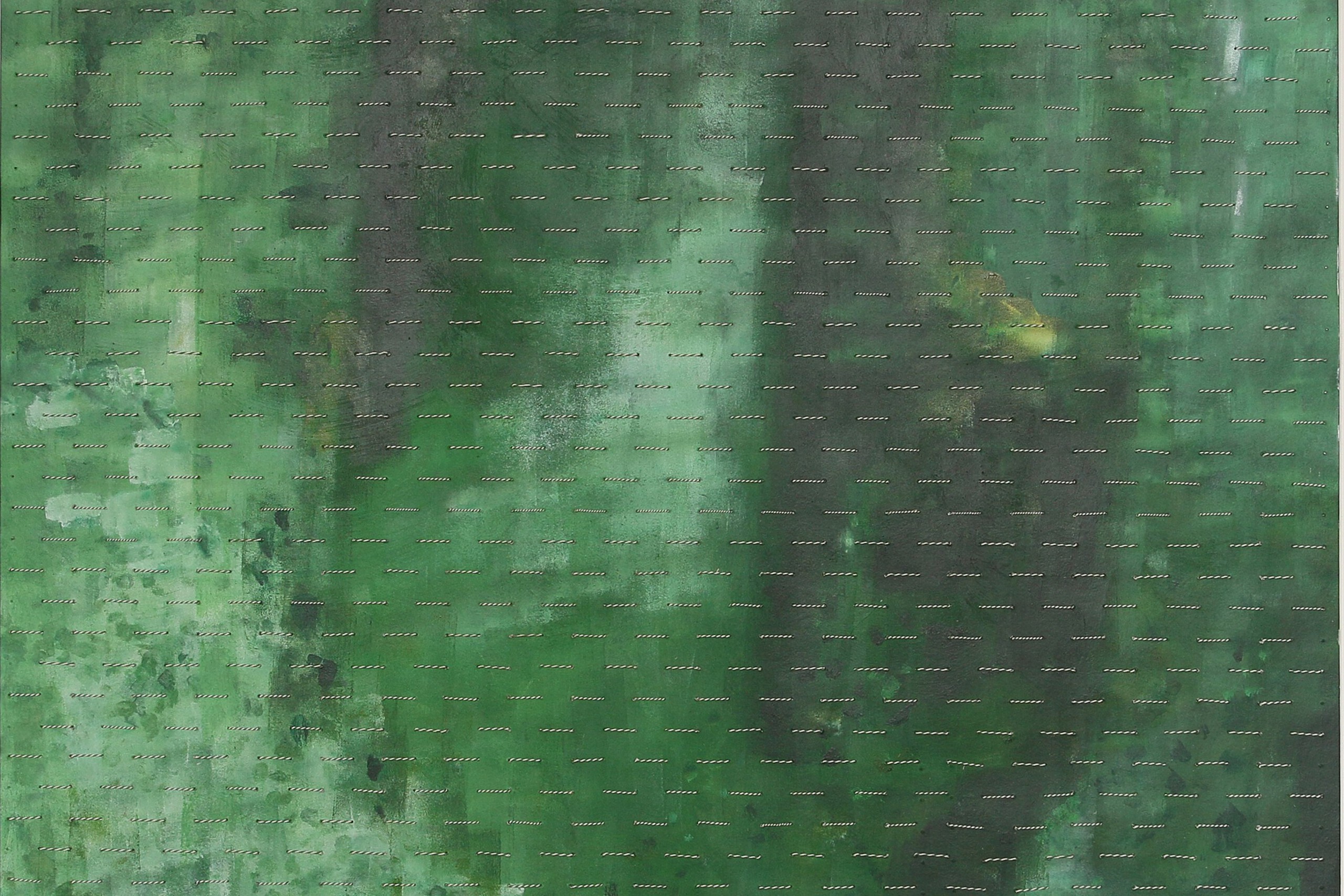 Met acryl beschilderd papier, geborduurd met groen rolladedraad