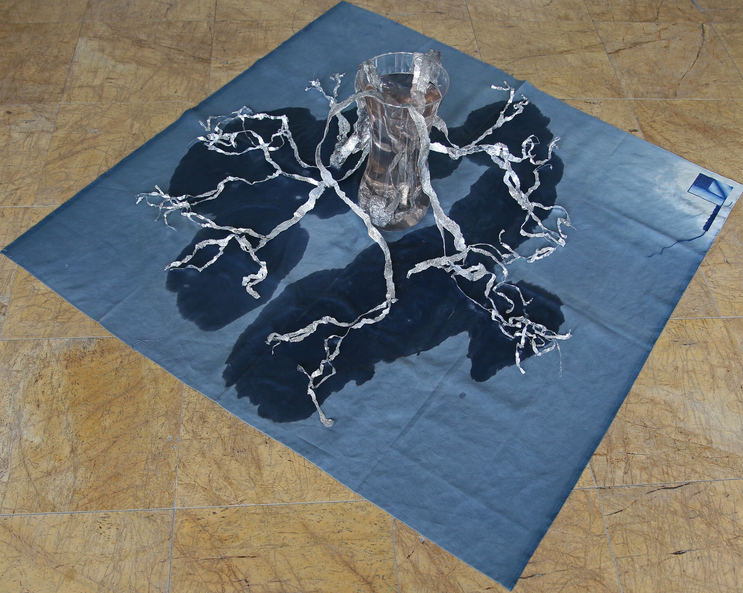 Een vaas met zilverpapieren bloemen op een blauw kleed. Het water loopt langzaam langs het zilverpapier en kleurt het kleed diepblauw
