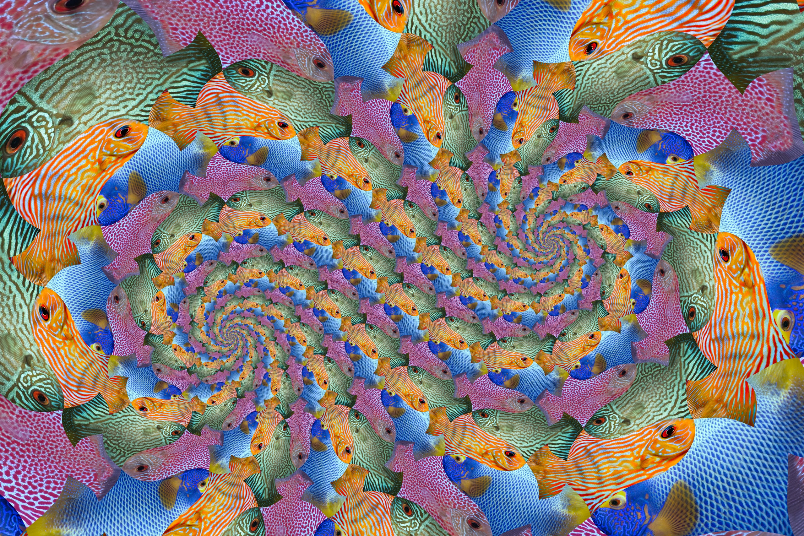 De asymmetrische dubbele spiraal heeft 5 armen en 8 loodrechte armen. De 5 armen zijn duidelijk waarneembaar door het volgen van de (bijvoorbeeld oranje) vissen die achter elkaar zwemmen. De 8 armen kunnen worden geteld door een geschikte oranje vis te kiezen, 8 oranje vissen naar voren te gaan en dan loodrecht 5 oranje vissen omhoog/omlaag (via de roze vis), om uiteindelijk terug te keren bij de gekozen vis. Dit werk wordt afgedrukt als gallery-bond (tussen acrylglas en aluminium).