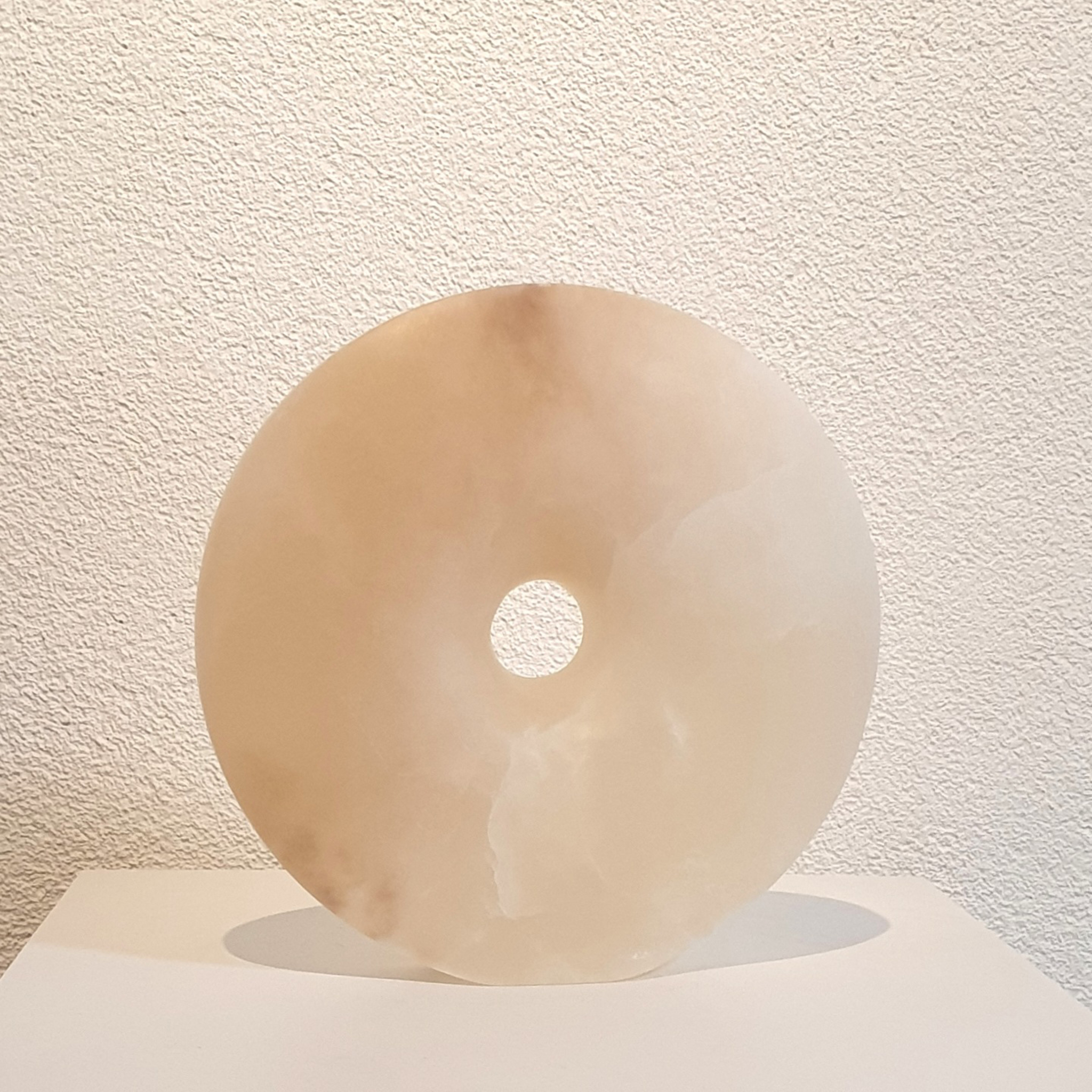 Ronding 1 is onderdeel van een serie van 3 albaste schijven. Je blik wordt getrokken naar de opening in het midden