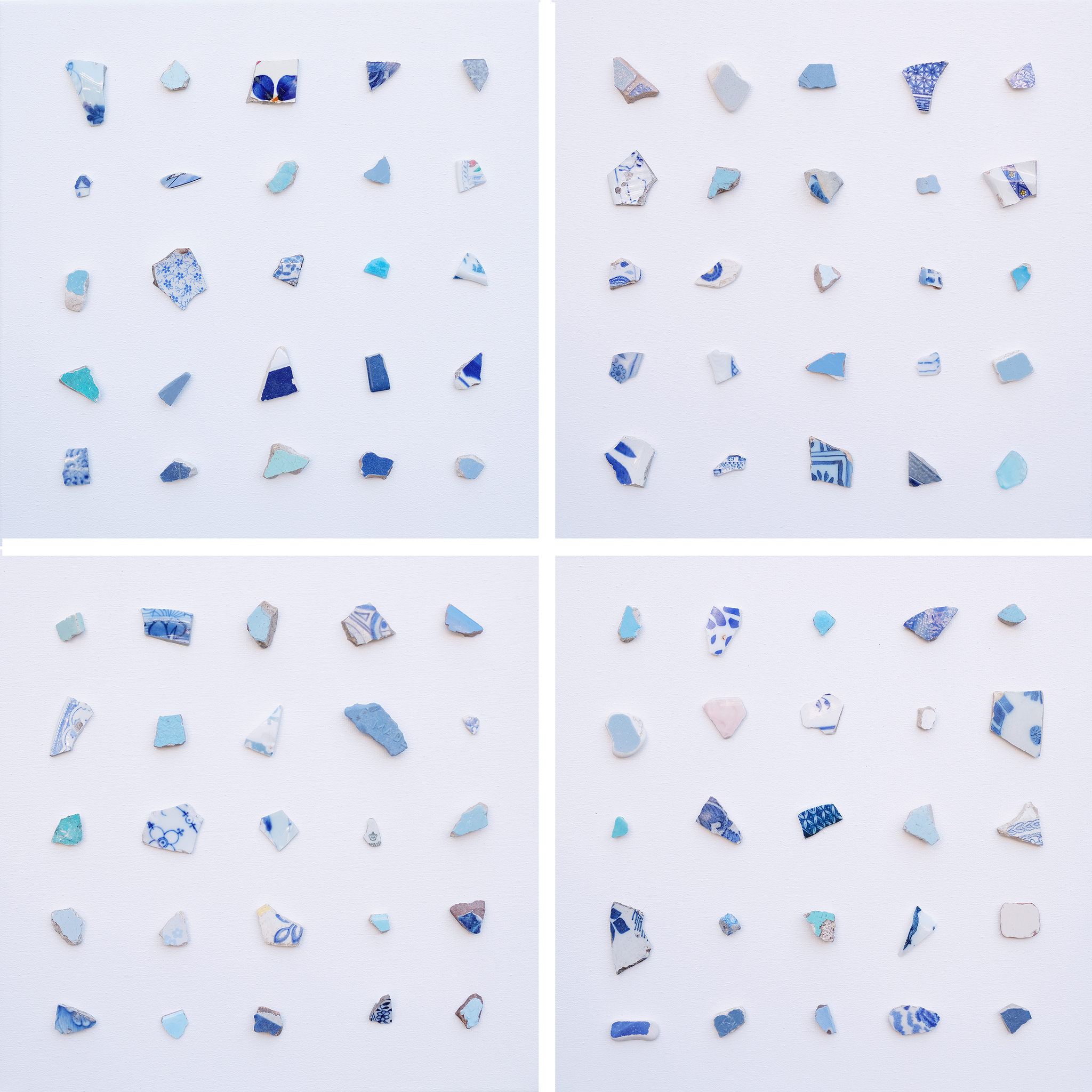 al wandelend verzamelde ik 100 scherfjes keramiek en glas, deze verzameling leidde tot dit geordende werkstuk.. zo kon ik struktuur brengen aan een woelige periode. 4 - luik doeken van 30 - 30 cm 3D