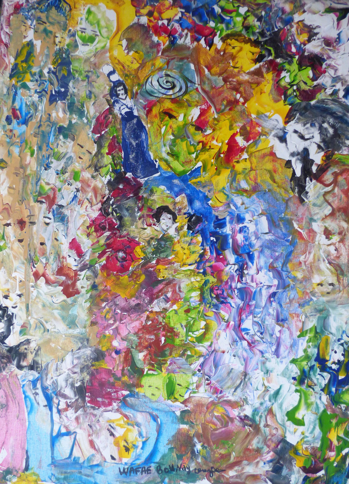Ik ben Wafae el Houari, geboren in Marokko. In het verleden heb ik aardewerk versiering gedaan en recent heb ik een passie voor schilderen ontwikkeld. De rode draad in mijn werk zijn vrouwengezichten. Ik gebruik het als een manier om droefheid en geluk uit te drukken. Ik schilder voornamelijk op papier en canvas, maar gebruik ook andere methoden, zoals marmering van papier.