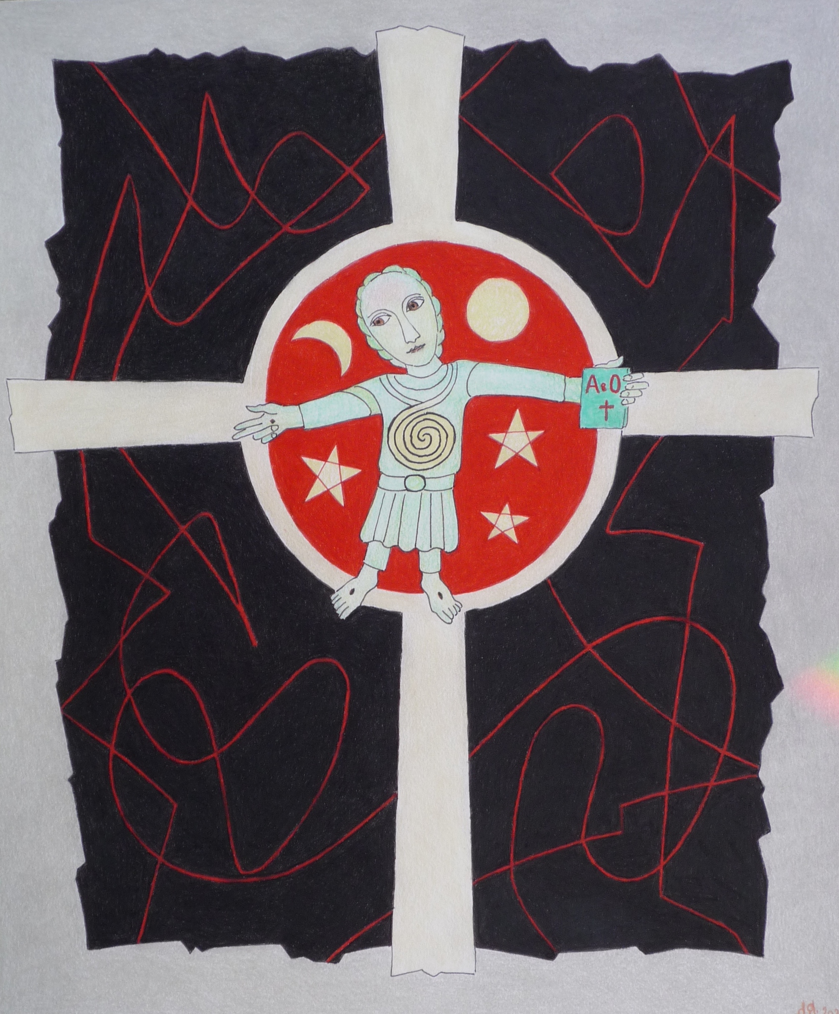 Wit Zon Rood Zwart Maan Sterren Godheid Kleurpotloodtekening