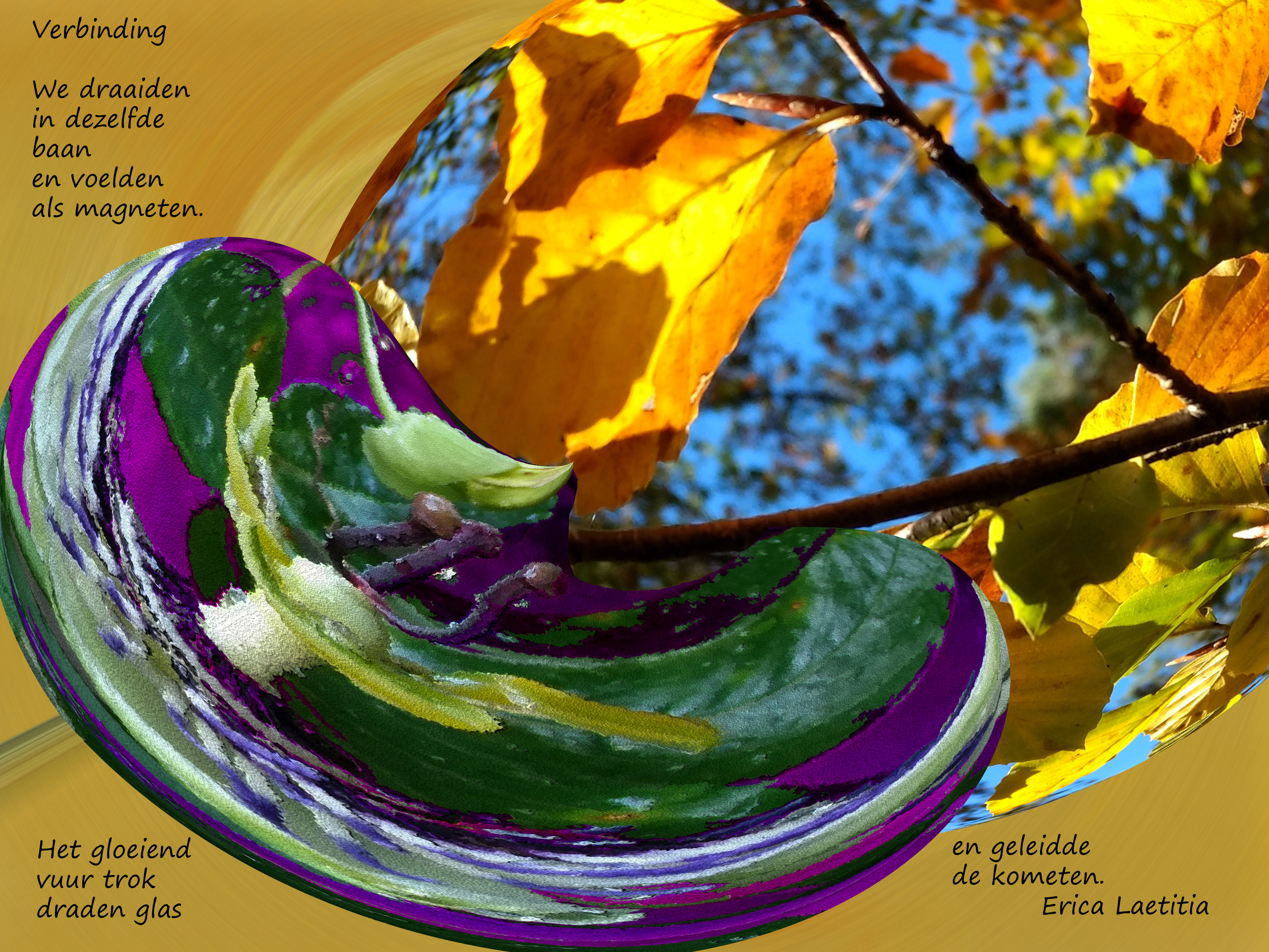 Dit werk gaat over de sterke verbinding die mensen onderling kunnen voelen. De woorden vuur en magneten in het gedicht spreken voor zich. In het paars is een passiebloem herkenbaar. De foto wordt afgedrukt op aluminium, canvas of een ander materiaal en voorzien van een ophangsysteem. Maat en prijs in overleg.