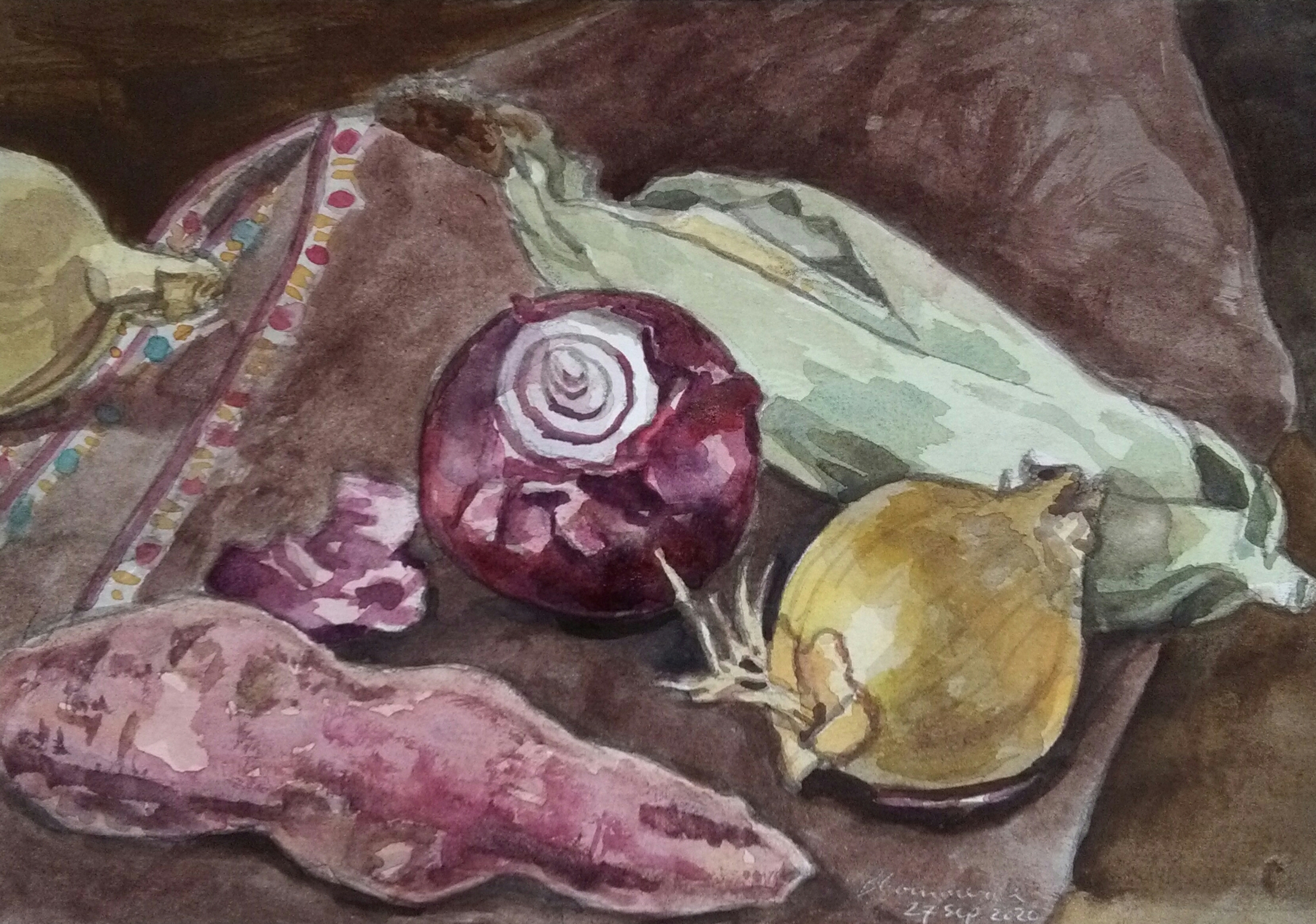 Realistisch Figuratief Aquarel Stilleven Keukenstuk Ui Maïs Aardappel