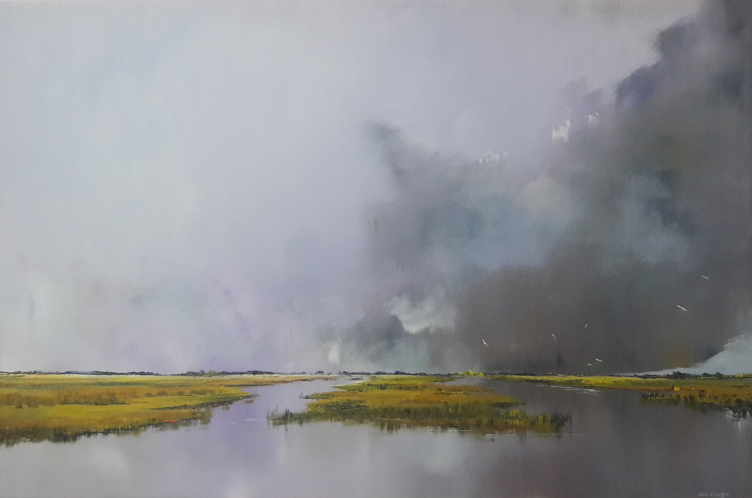 Realistische aquarellen en olieverf schilderijen van Hollands landschap, met altijd expressieve luchten boven de lage horizon zich spiegelend in de waterrijke polder. Ook werken uit de Franse Morvan en van de Oostelijke Algarve in Portugal.