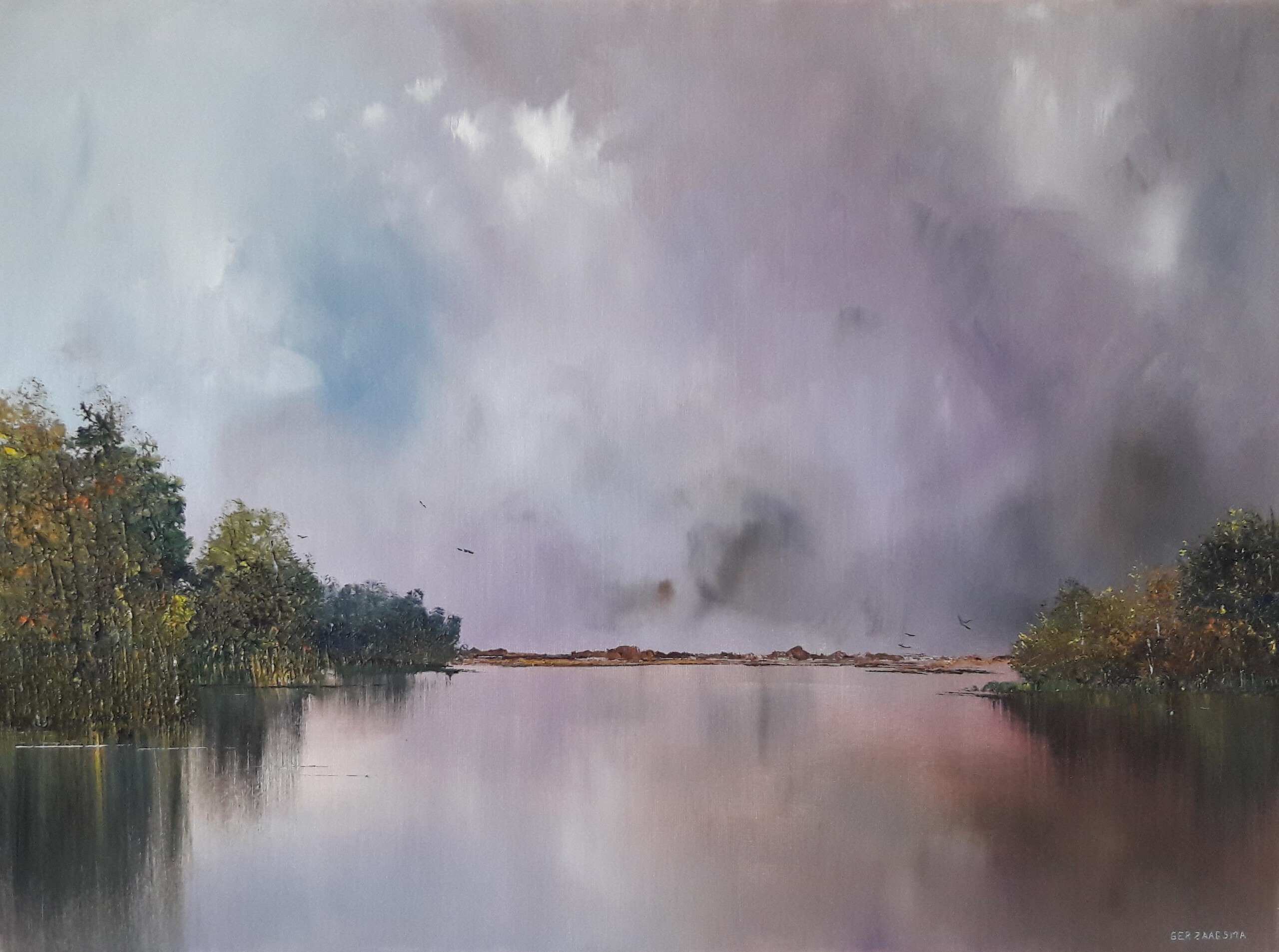 Typisch Hollandse wolkenlucht boven de polder. Behalve ander weer staat er niets te gebeuren. Te zien en evt. te koop bij galerie P. Groen in Marienheem