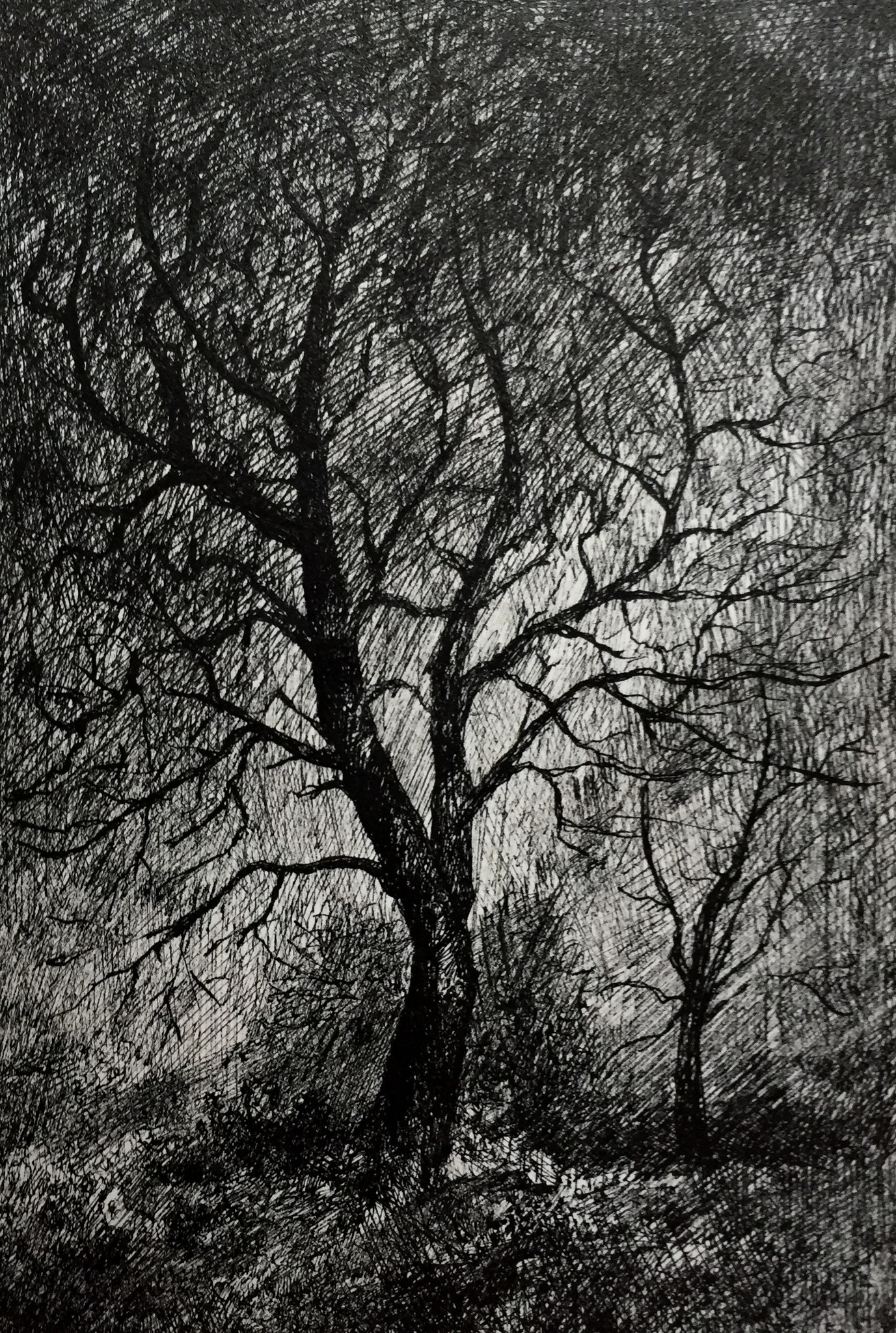 Werkt voornamelijk met Acrylverf, potlood en inkt. Is autodidakt.