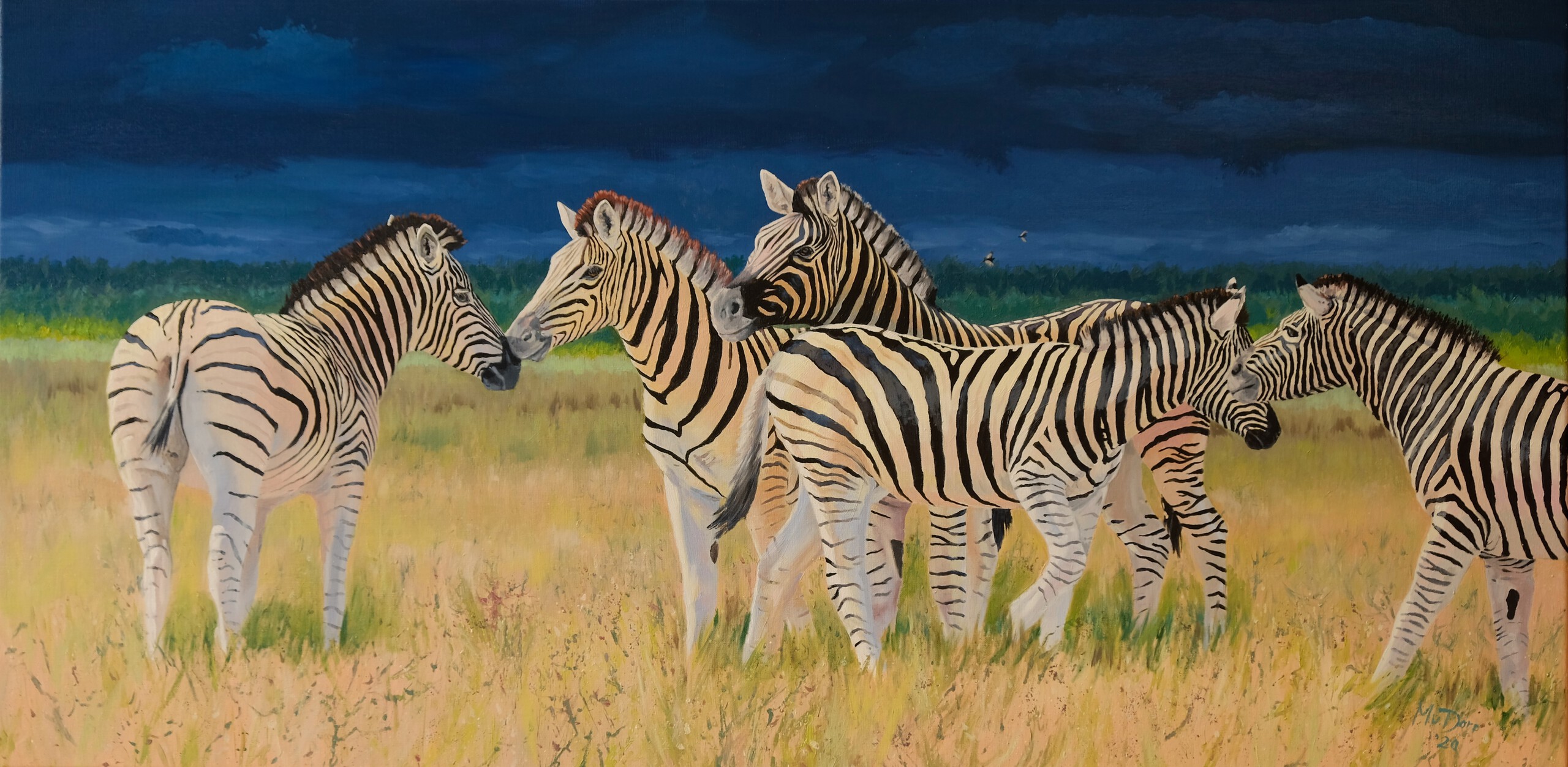 Deze zebra's stonden te knuffelen en spelen met elkaar vlak voor een enorme onweersbui in Etosha Park in Namibië