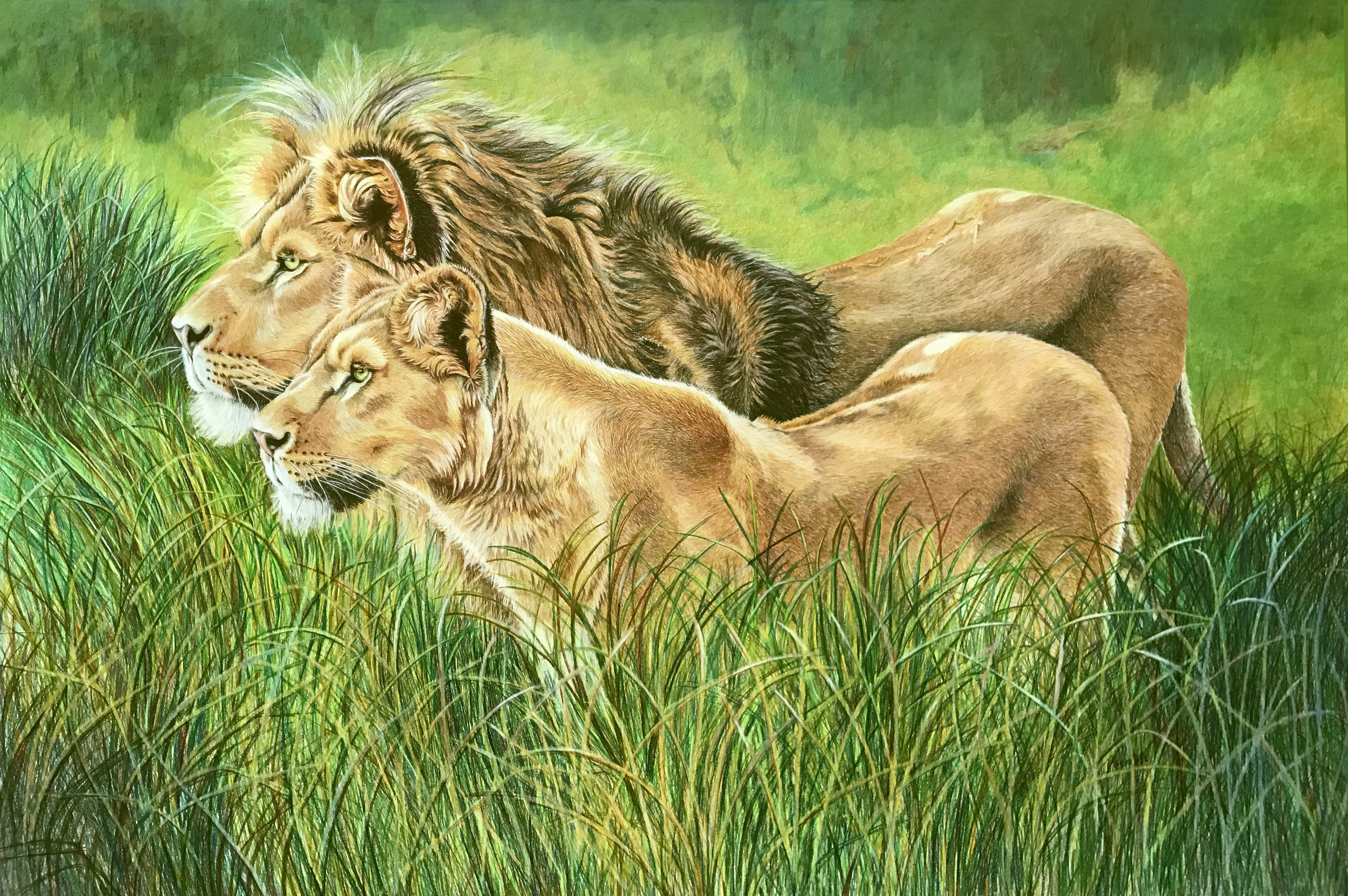 Rex en Regina, leeuwenkoppel, 150 x 100 cm, kleurpotlood-tekening met Caran d'Ache Luminance