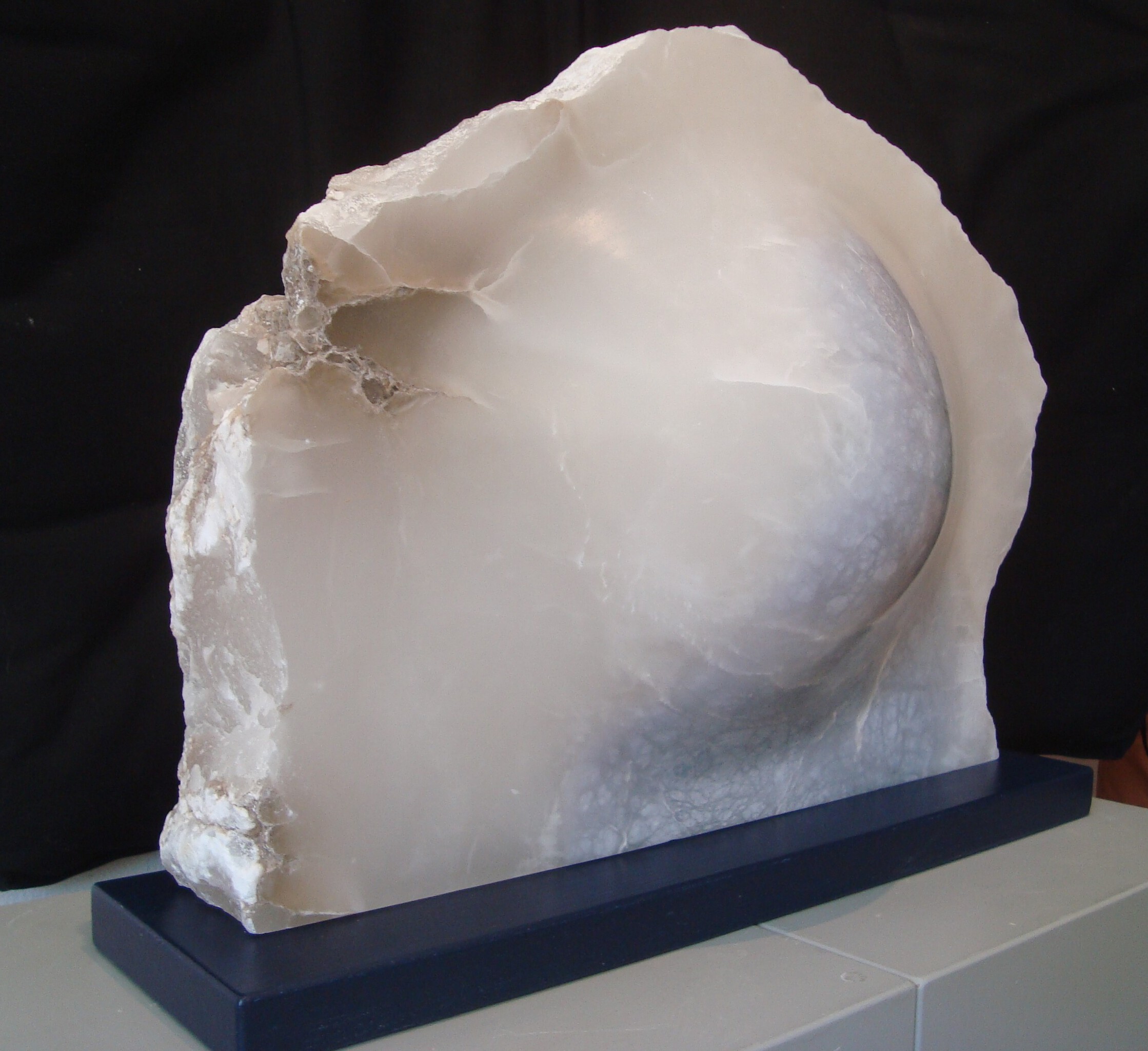 Het beeld is gemaakt van een wit/blauwe albast en prachtig transparant. Bol aan de voorkant en hol aan de achterkant. In de steen ligt een geheim verborgen........
